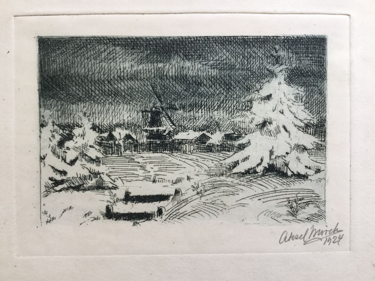 Radering af Aksel Mørch - Vinterparti med mølle 1924.
