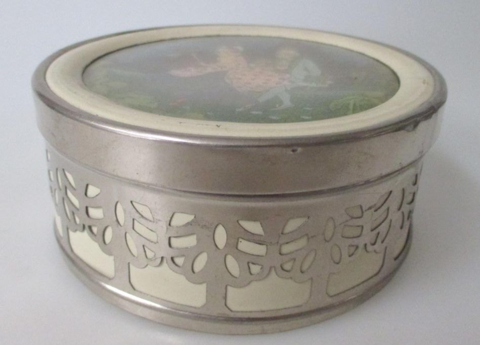 Art deco dåse i metal. Ca. 1930. På låg indlagt collage motiv med rococo scene. Dia.: 11 cm. Højde.: 5 cm.