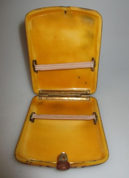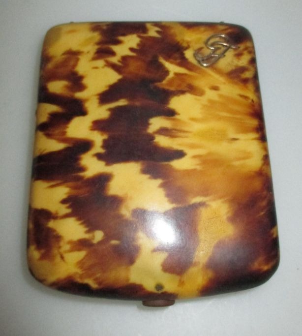 Cigaret etui, 20. årh. Kunst stof i gult/brunt som skildpadde. 8,5 x 7 cm.