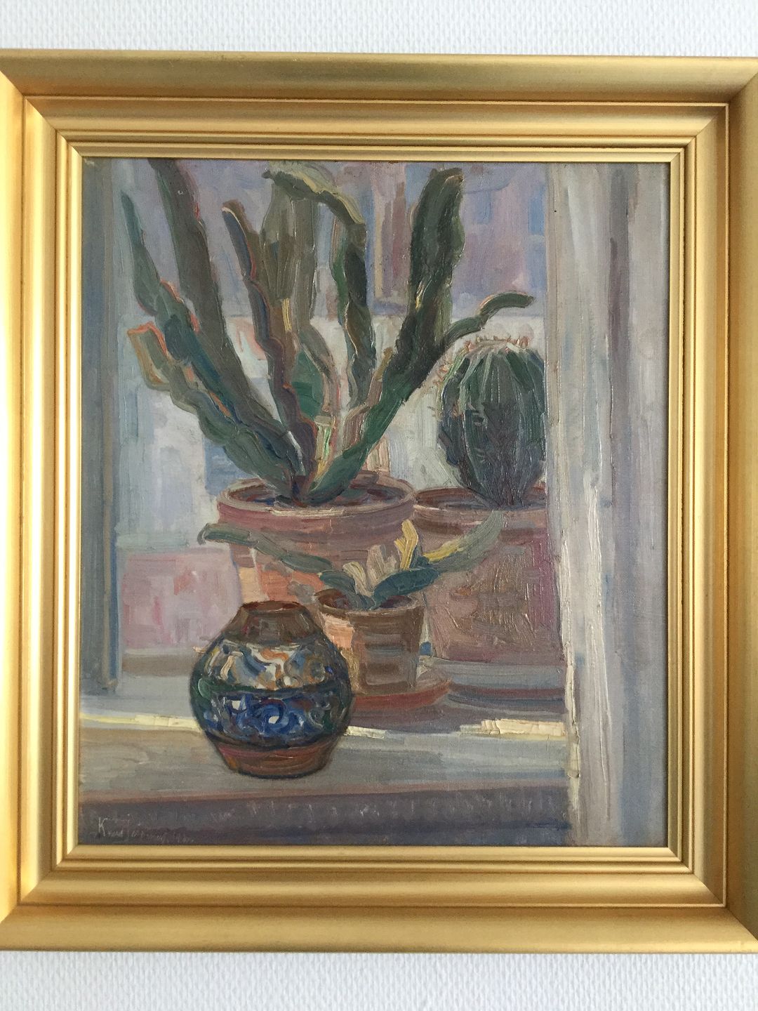 Opstilling i vindueskarm med vase og kaktusser 1916.