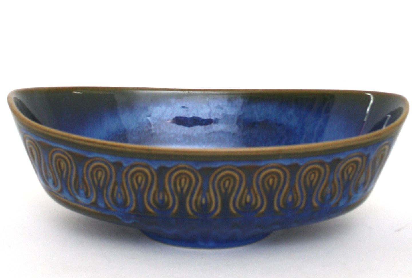 Søholm, Aflang skål i blå og brun glassur. Formnr. 2124. Højde 9,5 cm. Længde 28 cm. Bredde 17 cm. Flot stand få ridser indvendig. Pris: 450 kr.