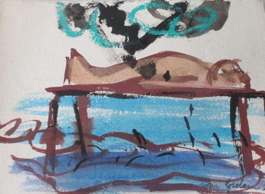 Gislason, Jon (1955 -) Denmark: A man is sunbathing on the beach. Bellehage. Watercolor. Signed. 22 x 29 cm.