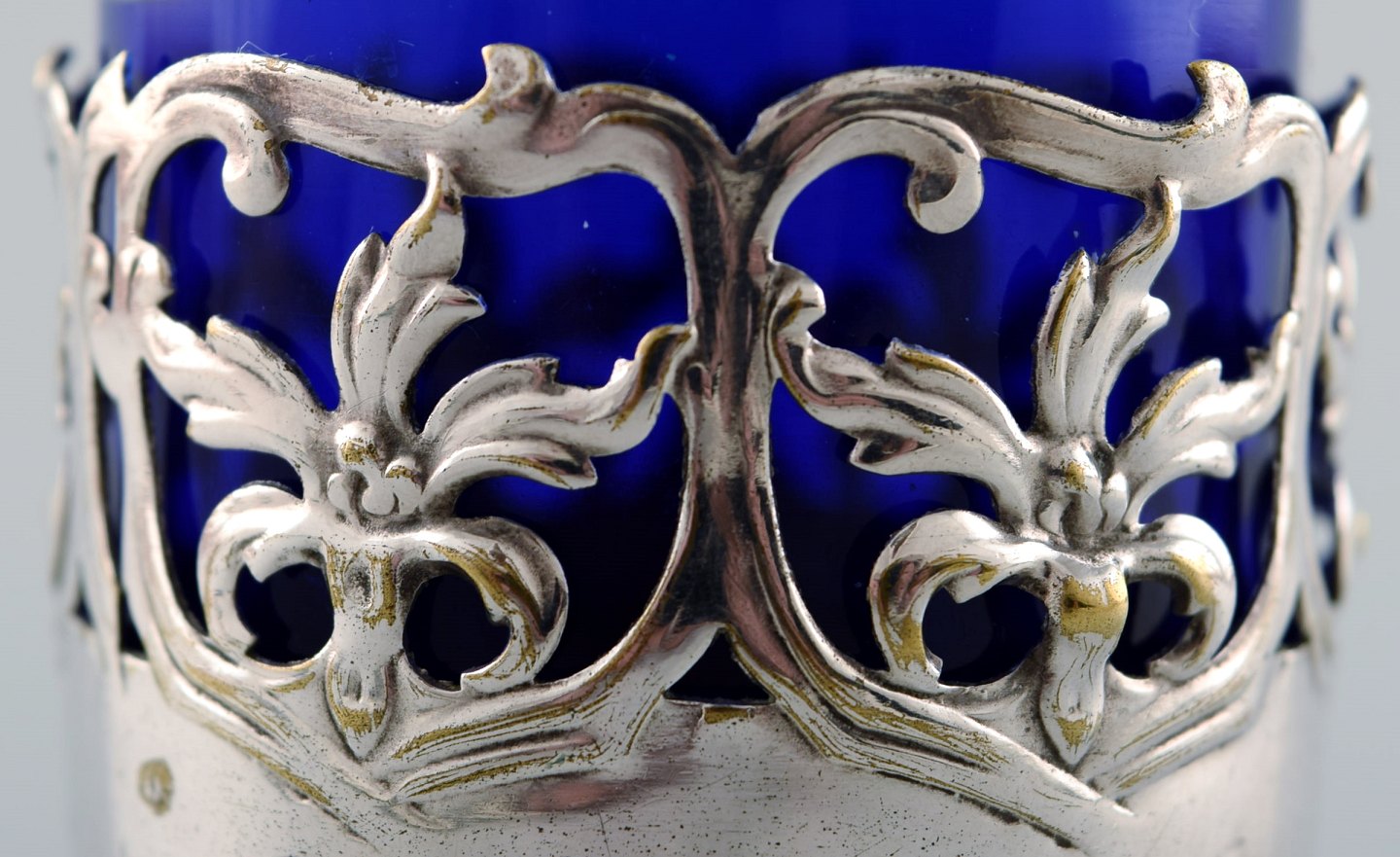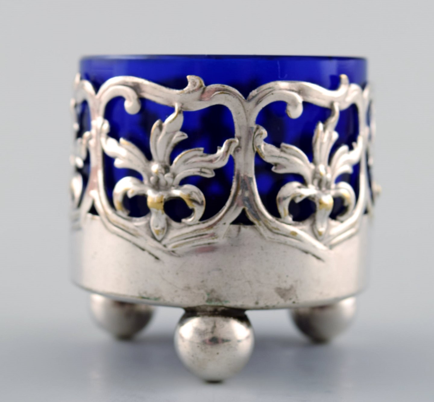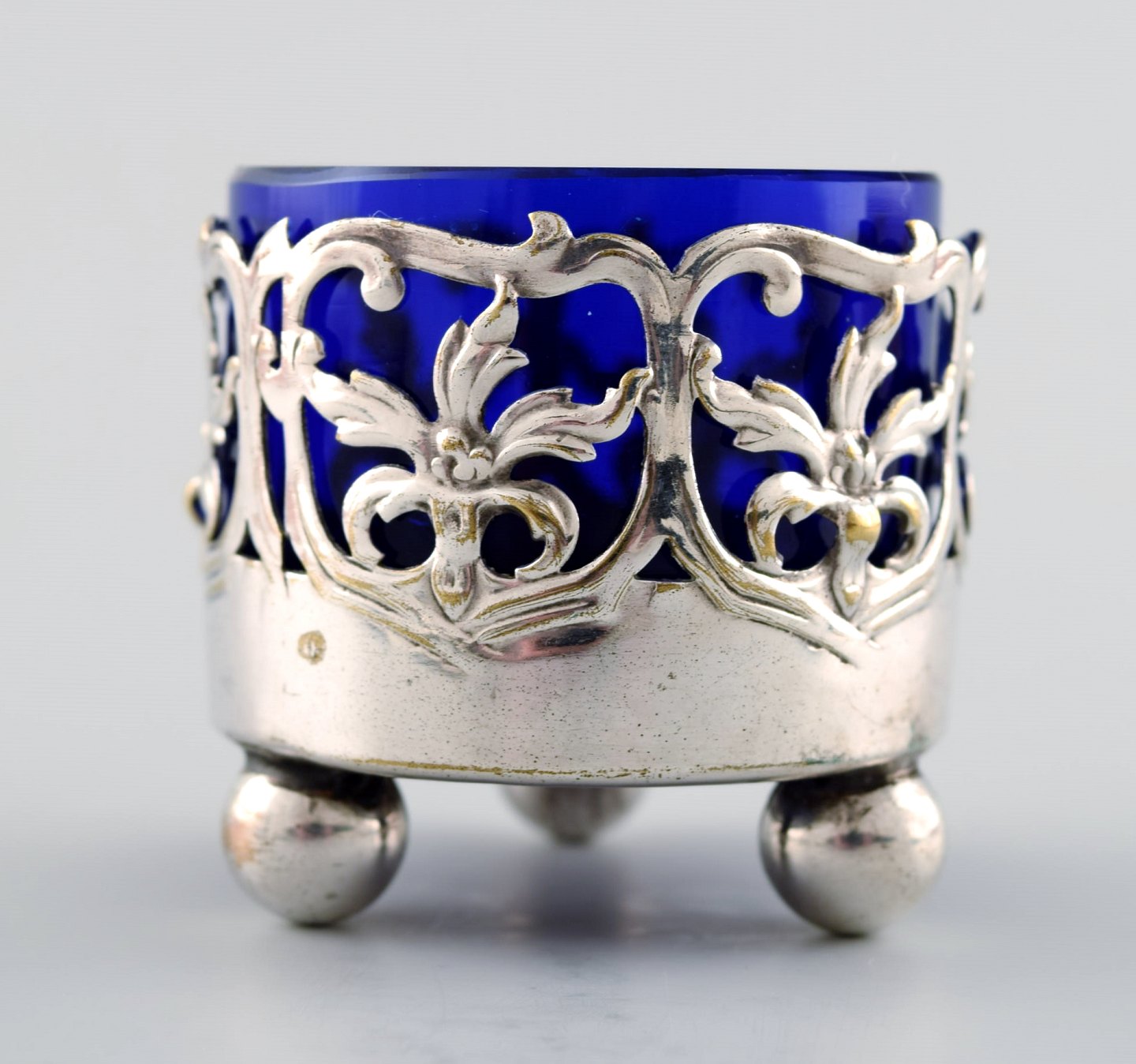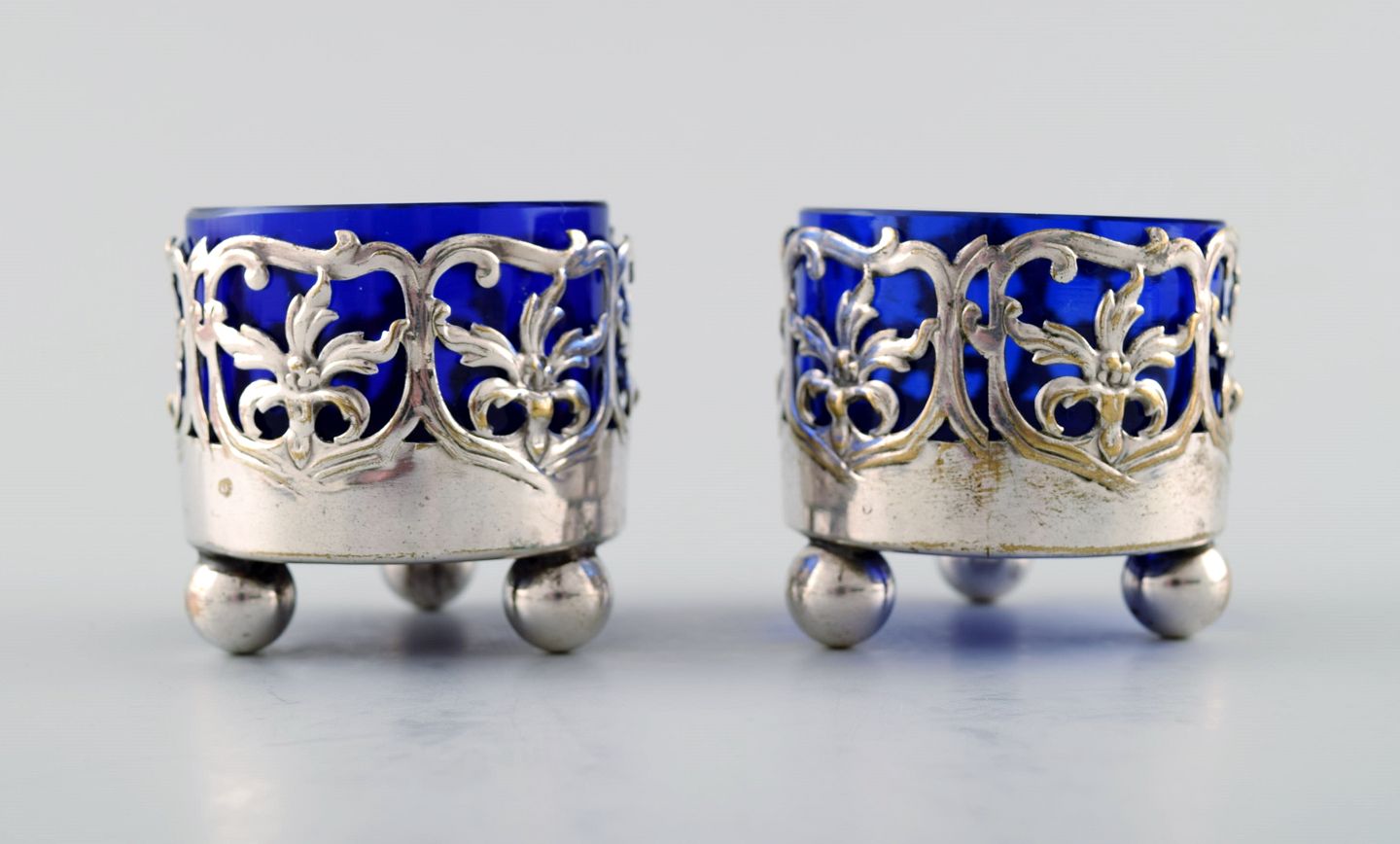 Et par engelske saltkar med glasindsatser i blåt af engelsk nysølv.