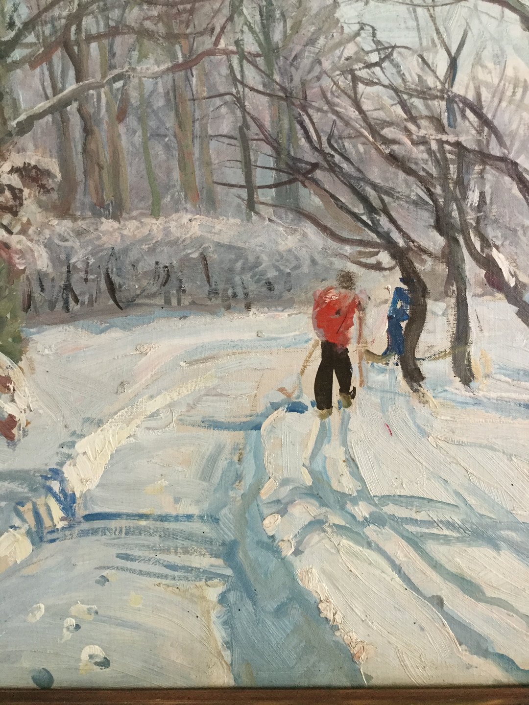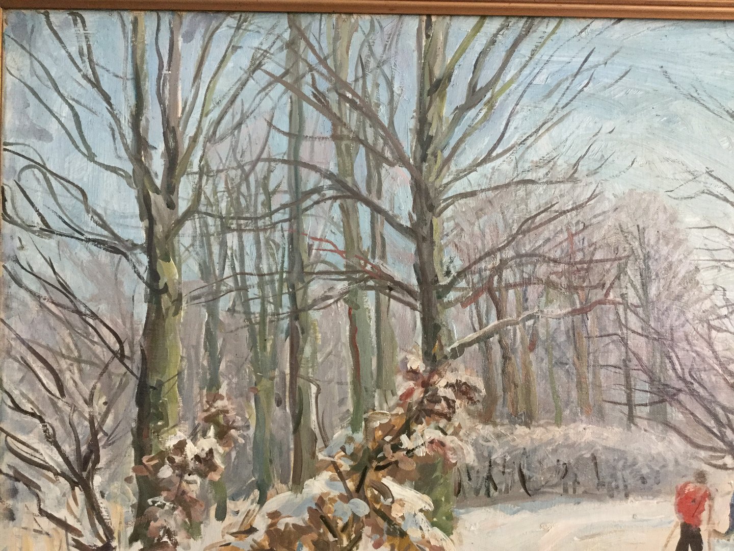 Maleri af Aage Bernhard-Frederiksen "Vinterparti fra skov med skiløbere"