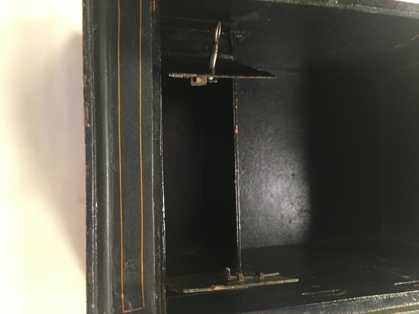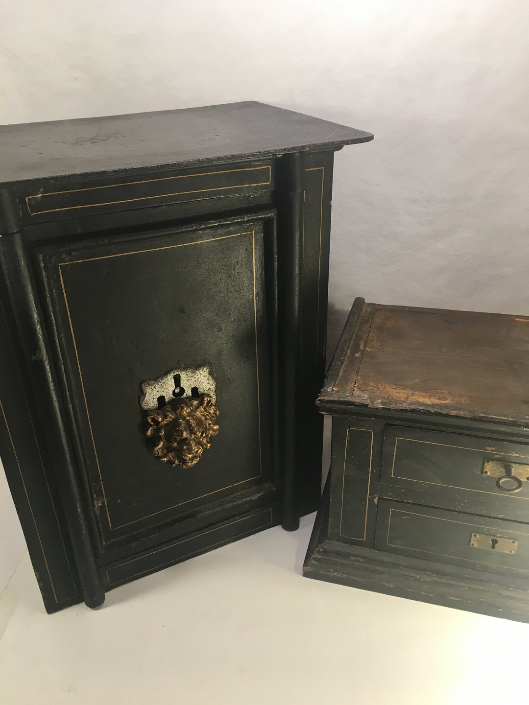 Gammelt unika pengeskab i miniature. stående på træ sokkel. med 2 skuffer.