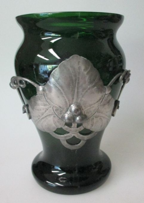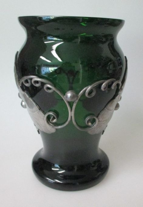 Grøn deco vase i glas med tin ornamentik, 1920' erne, Danmark. Højde.: 17 cm.
