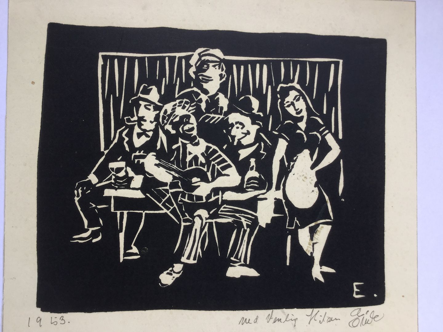 Linoleumssnit af Svend Erik Jensen 1953 - Værtshusscene.