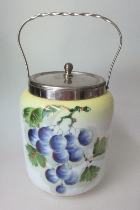 Engelsk bisquit spand, ca. 1900. I opaline glas med håndbemalinger af blommer. Med låg og hank i krom. Højde.: 16,5 cm.