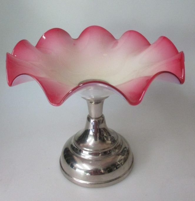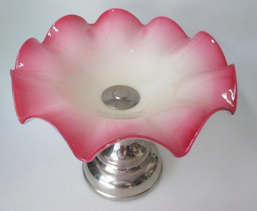 Tischschale aus weißem Opalglas mit hellroter Kante, ca. 1900. Deutschland. Am Fuß von Nickel. Höhe: 17,5 cm. Dia: 22 cm.
