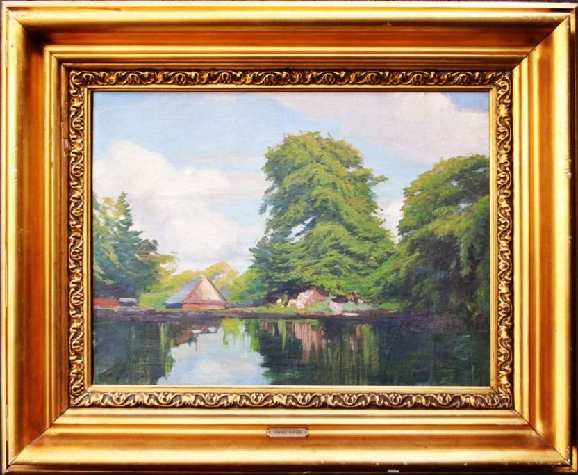 Hansen, Sigvard (1859 - 1938) Denmark: A mill dam at Århus. Signed Monogram 90. Oil on canvas. 43 x 58 cm.