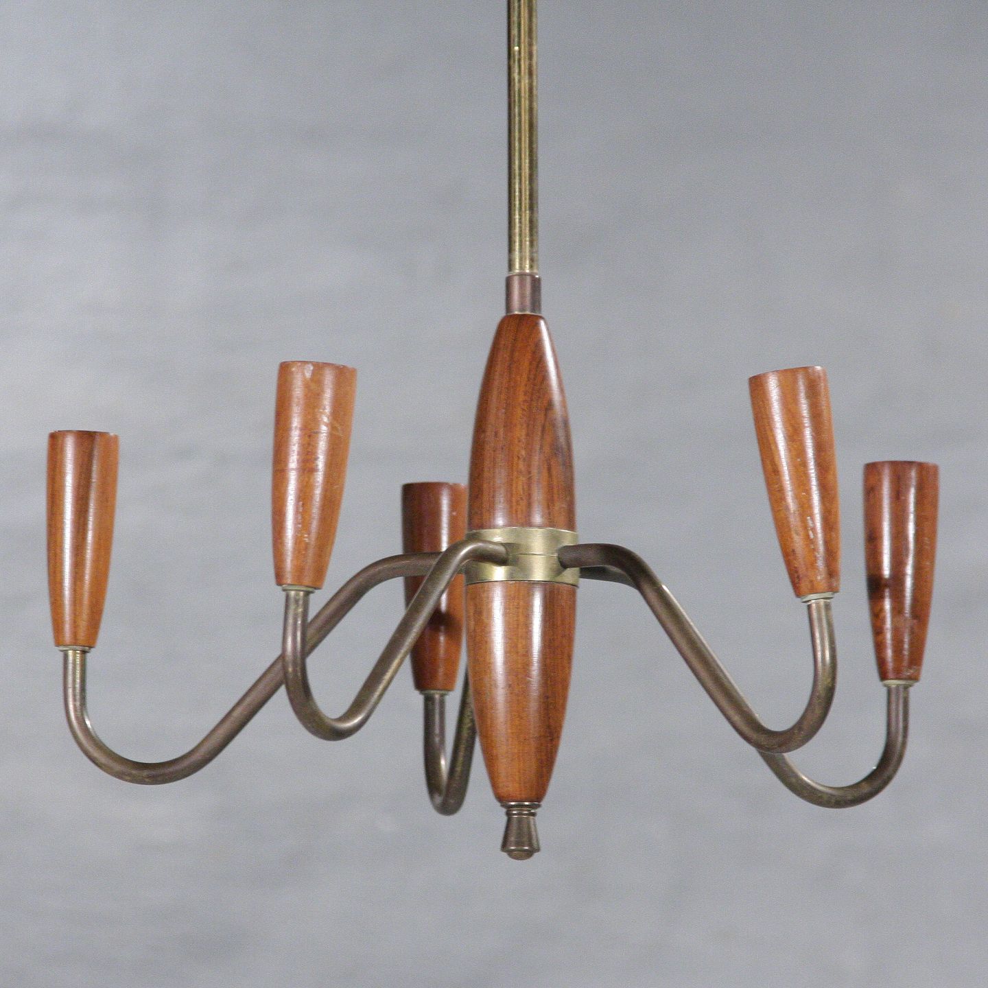 5-armet lysekrone i palisander og messing, 38 cm i diameter, ca. 1960