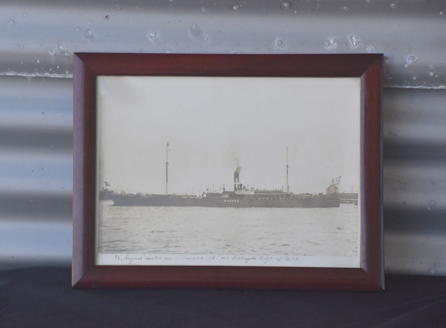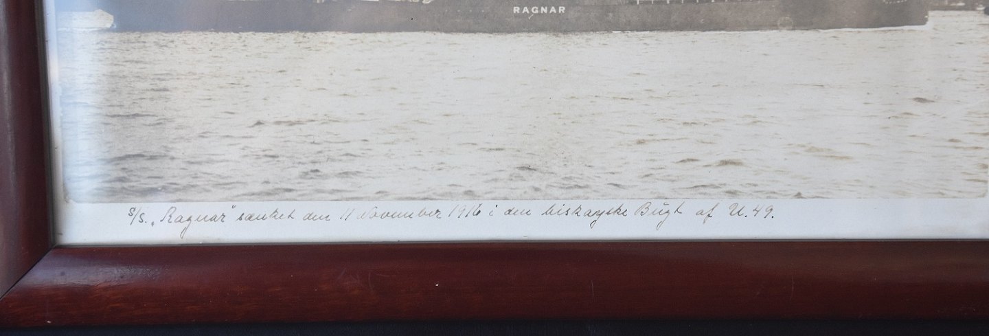 Gammel foto af skibet Ragnar, der blev sænket den 11. november 1916 i den Biscayiske Bugt af U49. tekst skrevet med fyldepen. Fotoet er i maghonie ramme, i flot stand.
