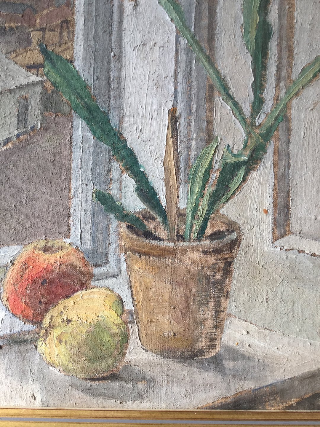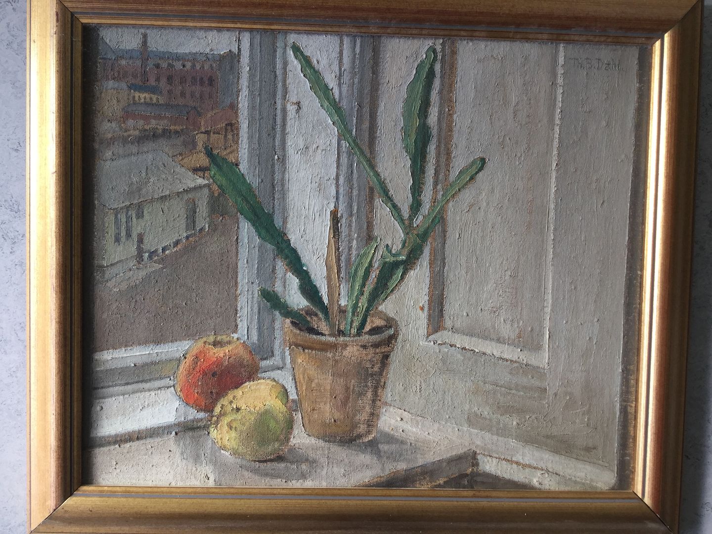 Maleri af Th. B. Dahl - Opstilling i vindueskarm med sukkulent og frugt.