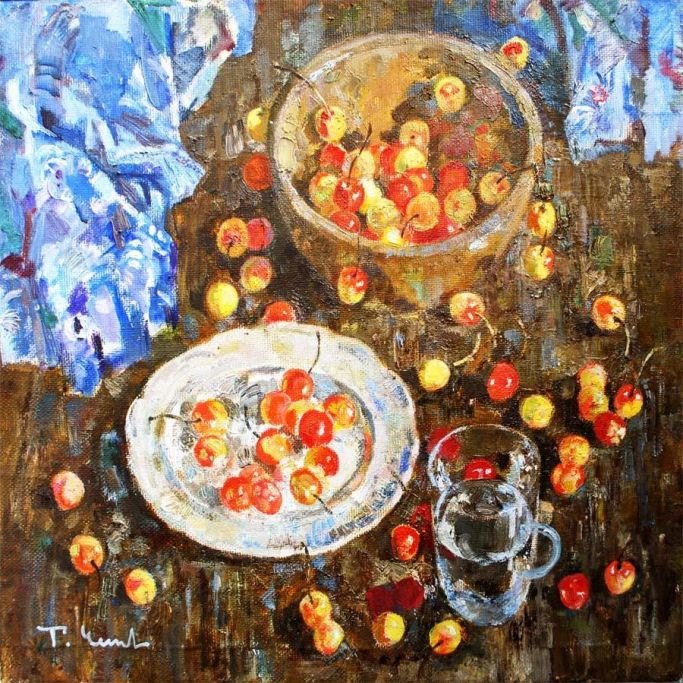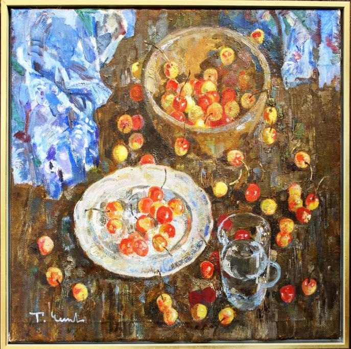 Chepikowa, Tatiana Alekseevna (1948 -) Russia: Arrangement with morello. Oil on canvas. Signed 1996.