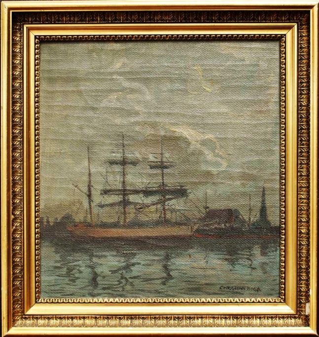 Bogø, Christian (1882 - 1945) Denmark. Ships in port. Signed. Oil on canvas. 41 x 39 cm.