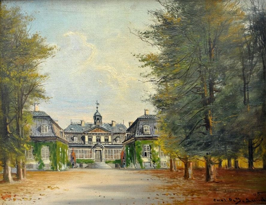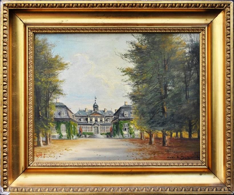 Lund, Carl O. J. (1936): Sorgenfri. Oil on canvas. Sign.: Carl OI Lund 05. 28 x 35 cm. With gold frame. This castle was built around 1790 to the hereditary Prince FrederikIt was built on  the foundations of the former castle. Designed by Peter Meyn. The Danish King Frederik 9. is born here.