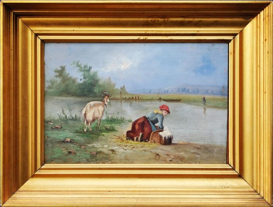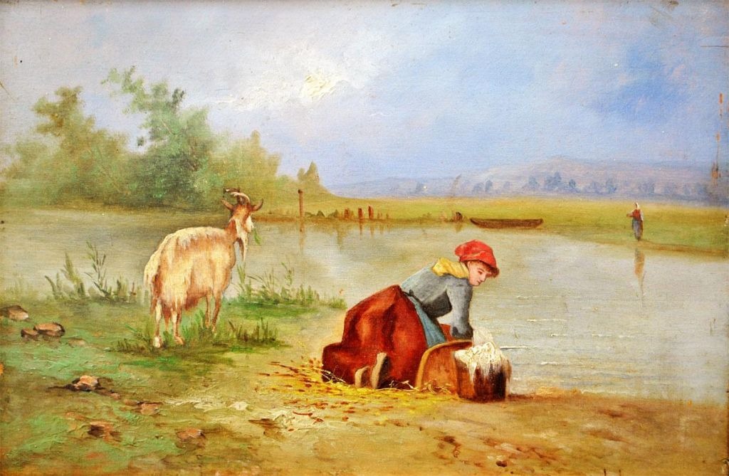 Lamy, Pierre François (1855-1919): Vaskekone ved en flod. Olie på træ. Sign.: F. Lamy. 22 x 33 cm.