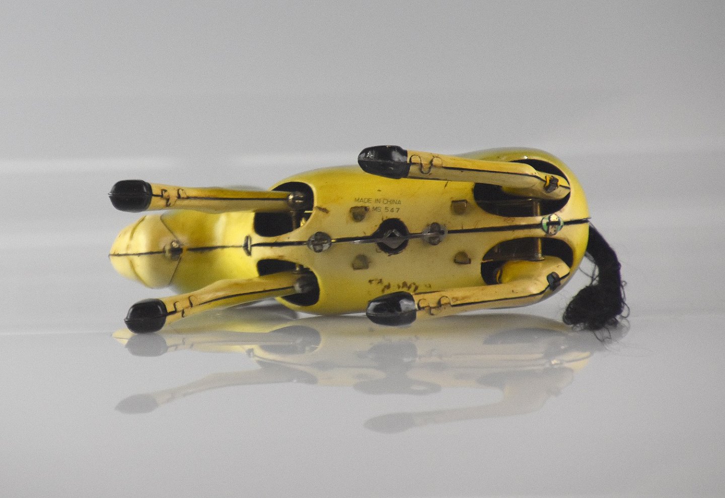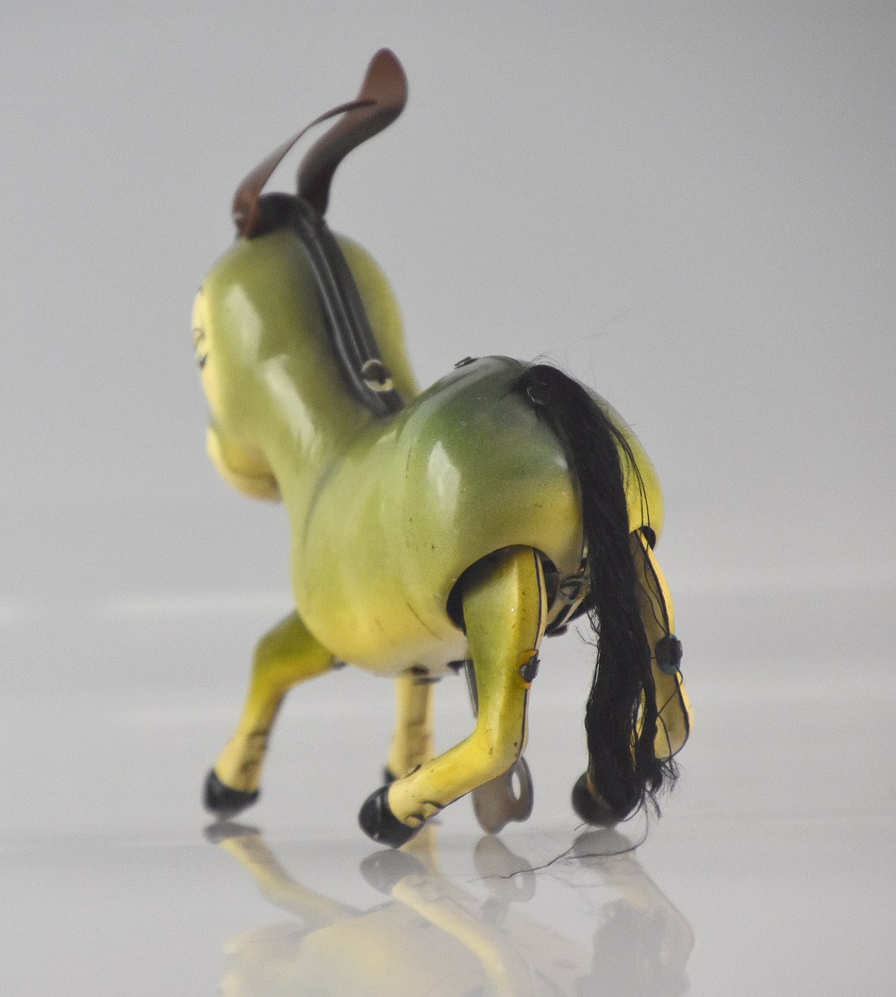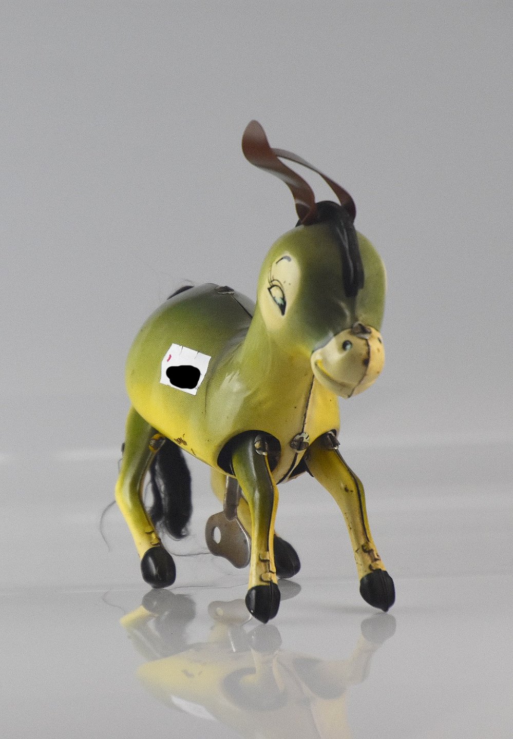 Mekanisk blik legetøjs æsel, æslet er grønligt, ørerne er af plast og manke og hale er af garn. Når æslet bliver trukket op hopper det fremad