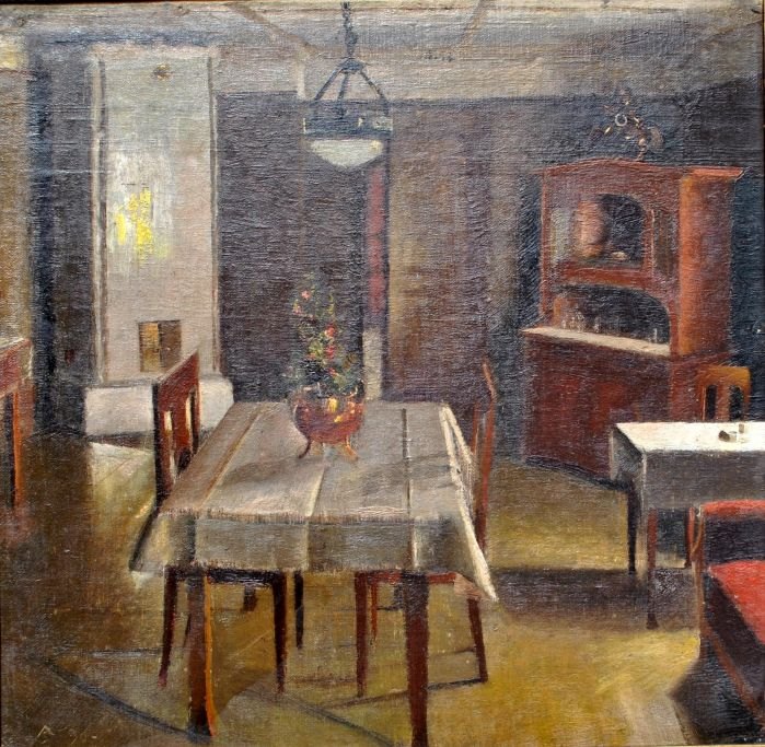 Søeborg, Axel (1872 - 1939) Danmark: Interiør. Olie på lærred(opklæbet på lærred.. Signeret.: Monogram 30. 40 x 40 cm.