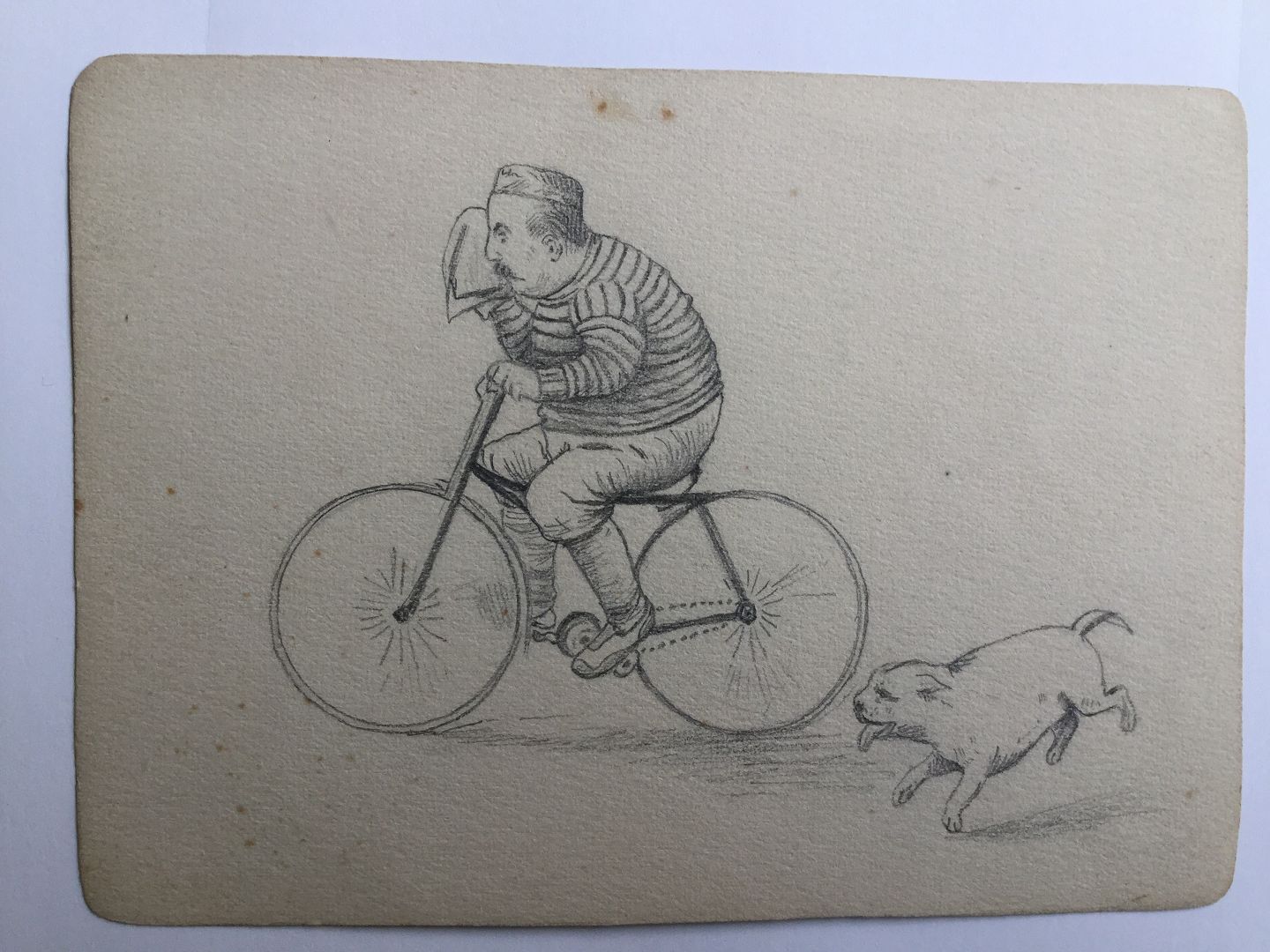 Tegning år ca. 1900 - Mand på cykel og løbende hund - antagelig af Alfred Schmidt.