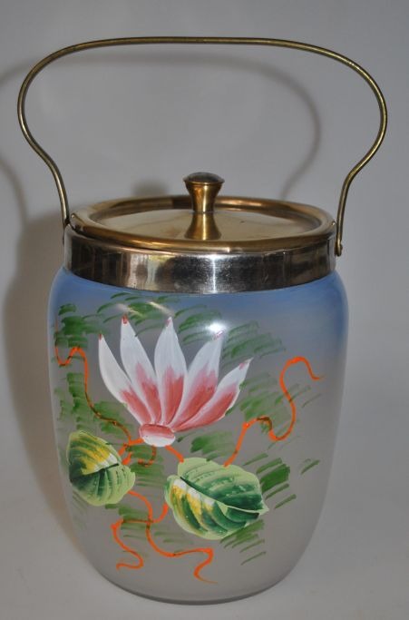 Bisquit bucket in painted glass, approx. 1900. Flower paintings with enamel. With handle and lid in nickel. Height: 16 cm.