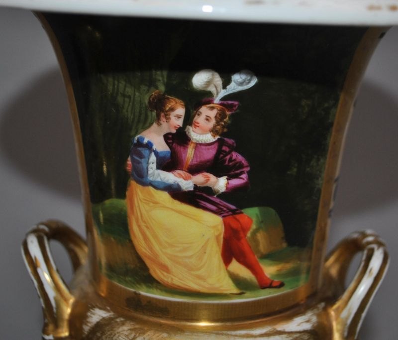 Pair of French empire vases, o. 1800. With handles and square foot. Decorated with romantic scenes. Hand painted and gilded. Height: 25.5 cm.