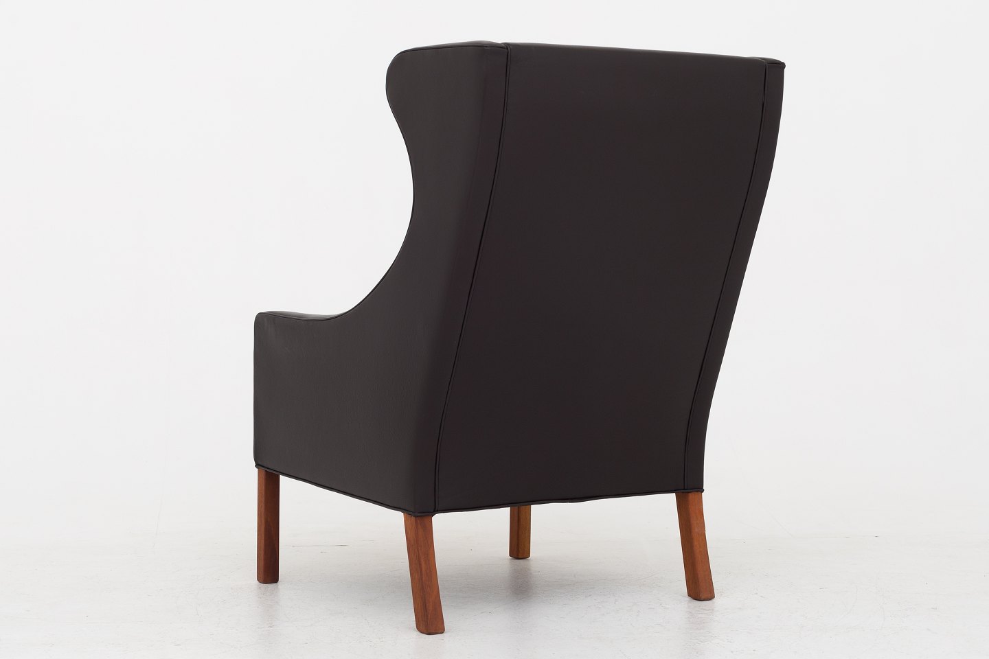 BM 2204 - Reupholstered Wing-back chair in Paris Brown leather w. legs of teak. We can offer upholstery of the chair in fabric or leather of your choice. Please contact us for further information.