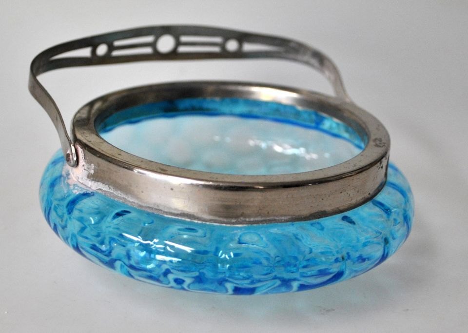 Sugar bowl in light blue glass, o. 1900, Germany. With nickel handle. Glass with inlaid decoration. Dia: 12 cm. Height with handle: 10.5 cm.