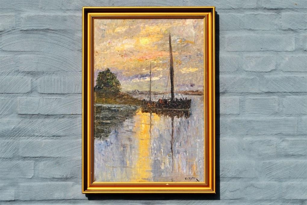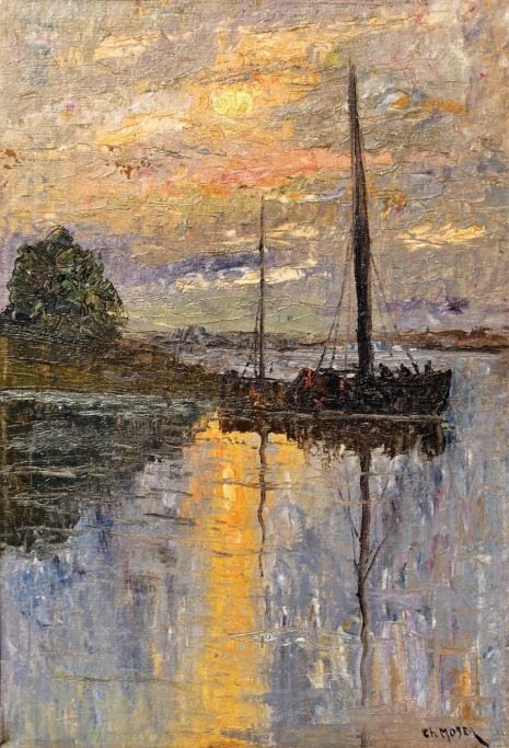 Moser, Christian (1838 - 1894) Holland: Sejlskibe på en flod - aften. Olie på lærred. Signeret.: Ch. Moser. 54 x 37 cm.