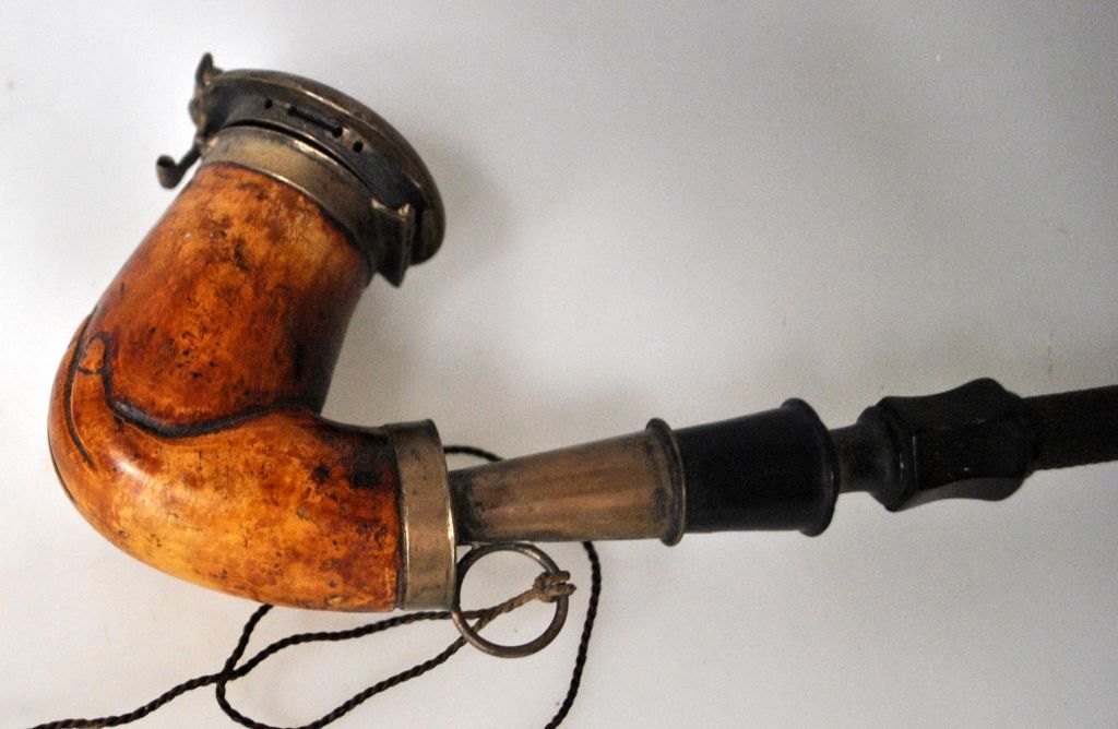 Meerschaum pipe, 19th century. Denmark. Cut with holding hand. With silver-plated lid. Length. 49 cm. Stir with, among other things, carved bone.