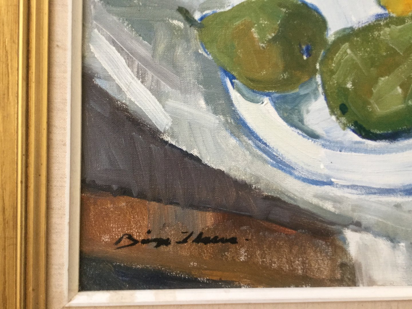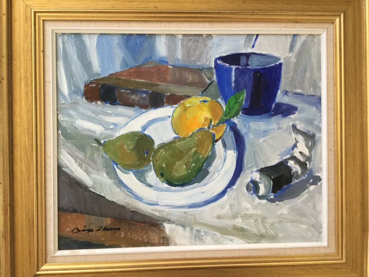 Opstilling på bord med frugt, malertube mv.