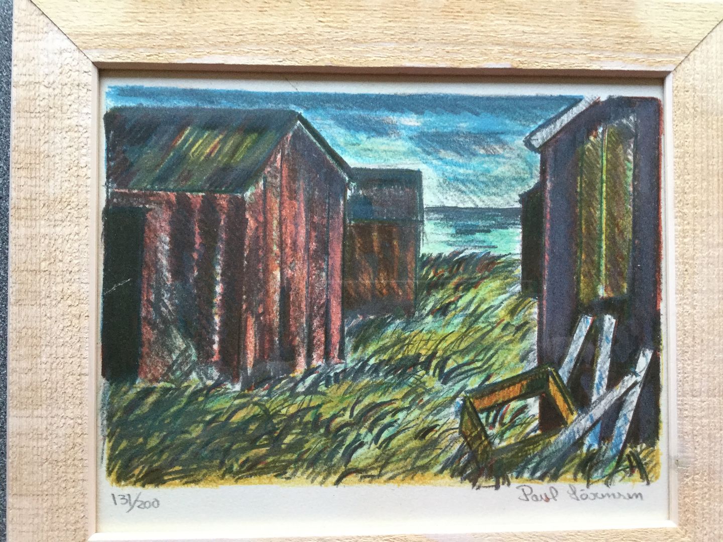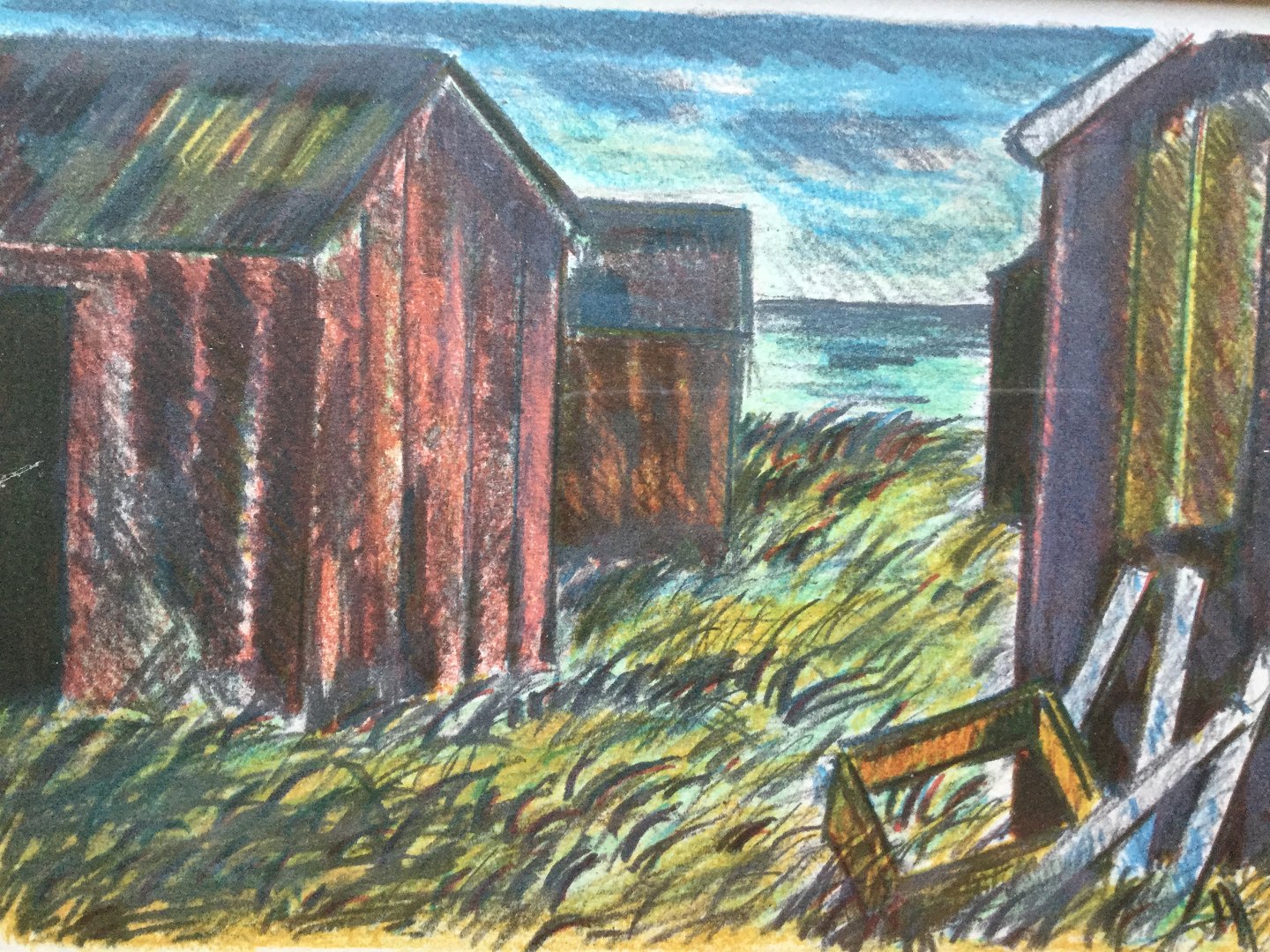 Litografi af Poul Sørensen - Fiskehuse ved havet.