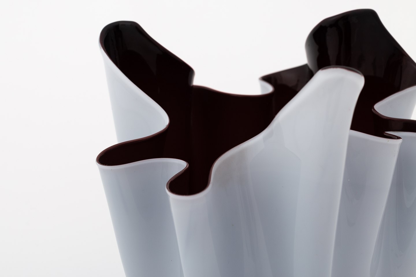 Fazzoletto vase in white and purple glass. Model: Handkerchief.