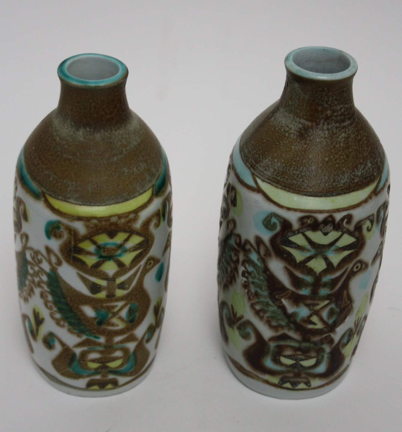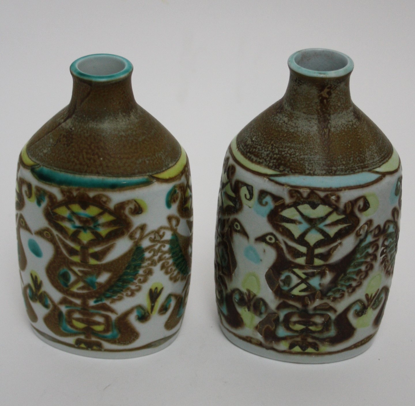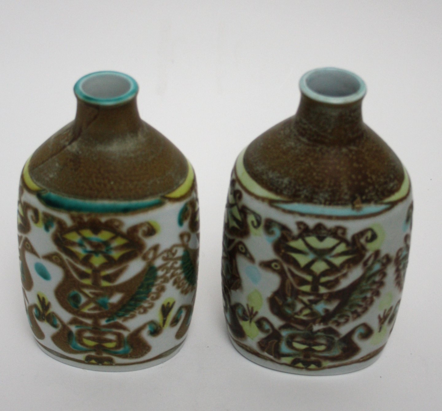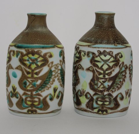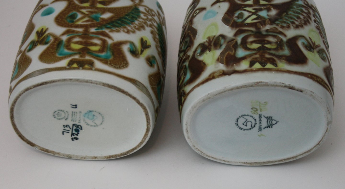 Text available in Danish: Royal Copenhagen/Aluminia, Baca, Vaser med fugle designet af Nils Thorsson. Produceret fra 1964 til slutningen af 1960'erne. Nr. 713/3208. Den ene af vaserne er stemplet med Royal Copenhagen og den anden med Aluminia. IV. sortering (medarbejdersortering).