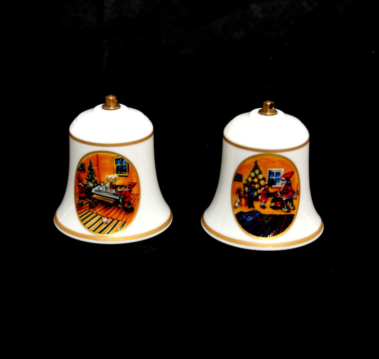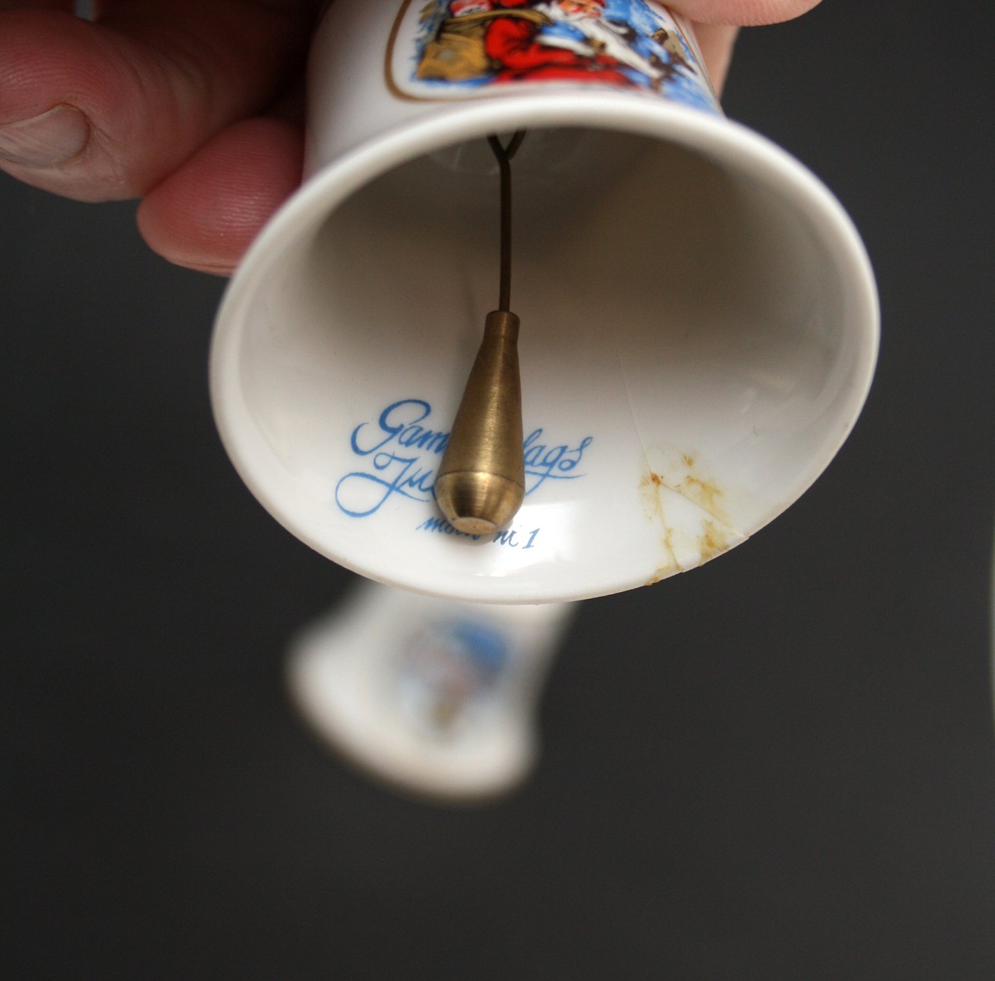 Rørstrand, Juleklokker med 2 klokker i originalæske. Porcelæn med messing ophæng og klokke. Pris: 175 kr. pr. sæt.