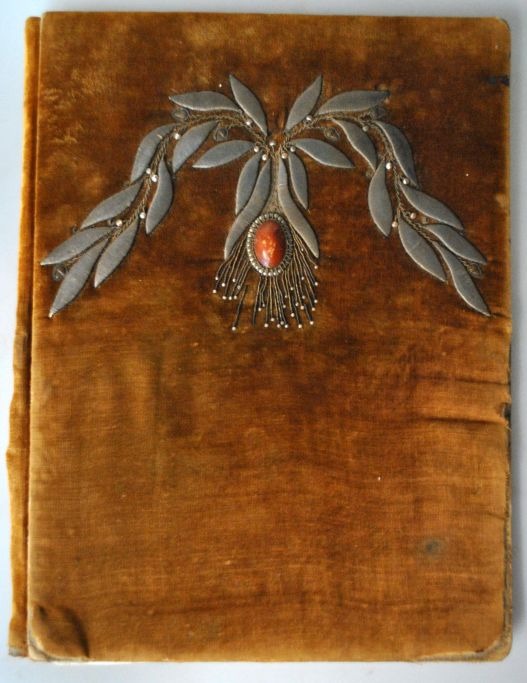 Brev mappe, jugend, dekoreret med sølvtråd, perler og rav, ca. 1900. Danmark. Udvendig beklædt med velour - indvendig med silke. Indvendig med rum.33 x 24 cm. Udlånt til TV programmet Krejlerkongen, 2020.
