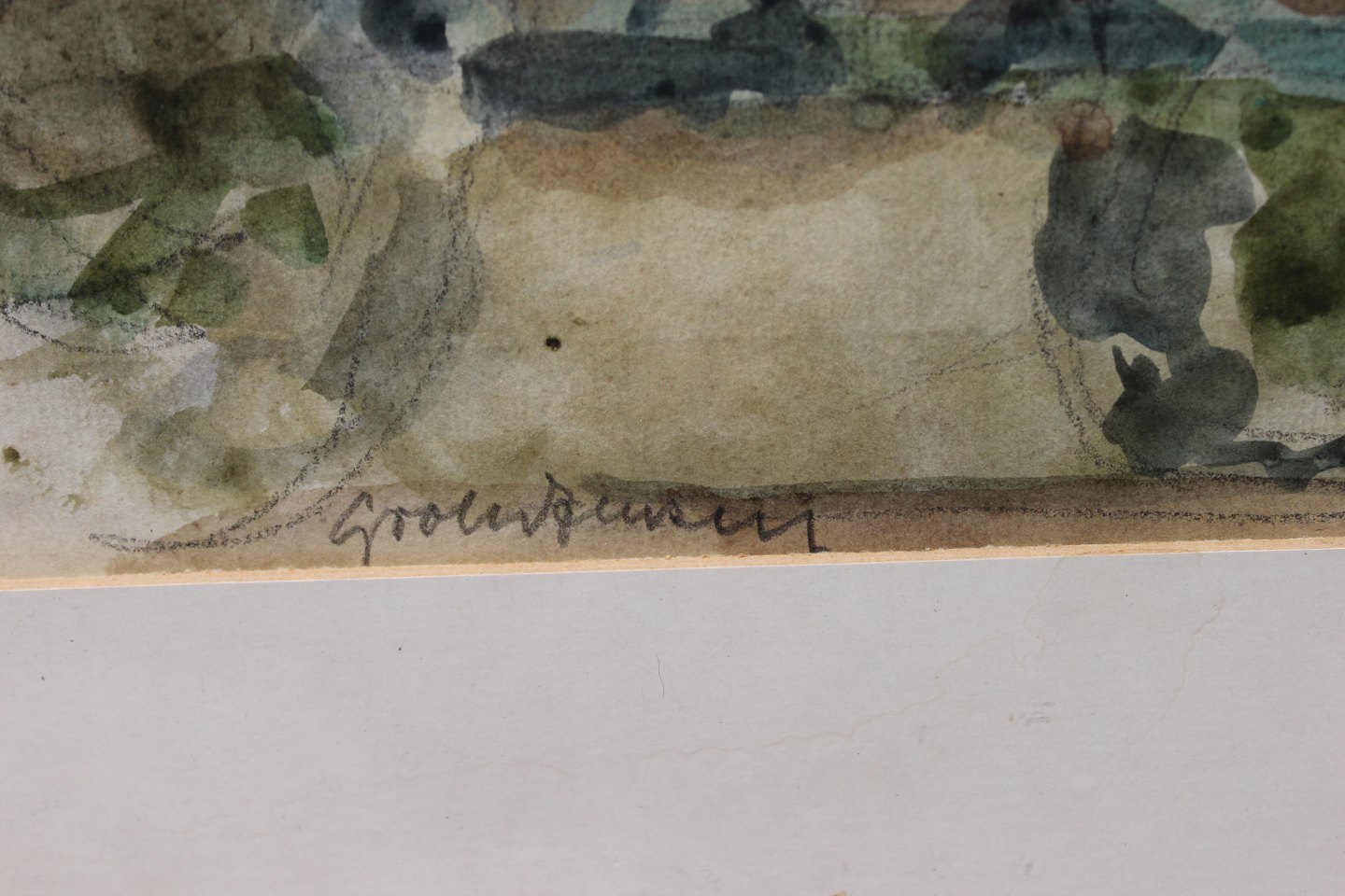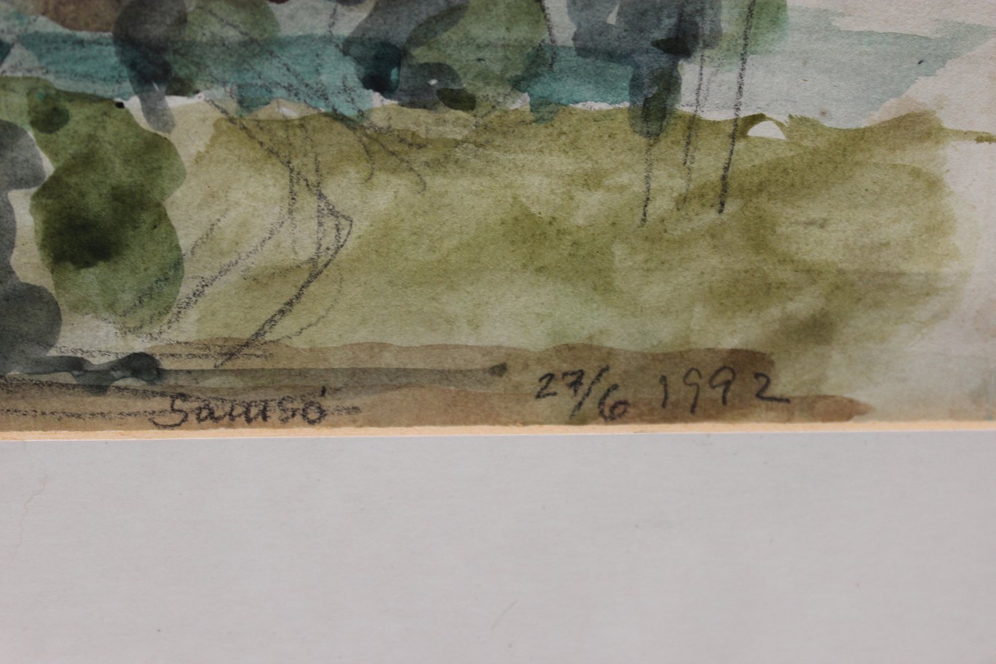 Watercolor in blue and green colors of Samsoe signed Jens Peter Groth Jensen from 27/6-1992.