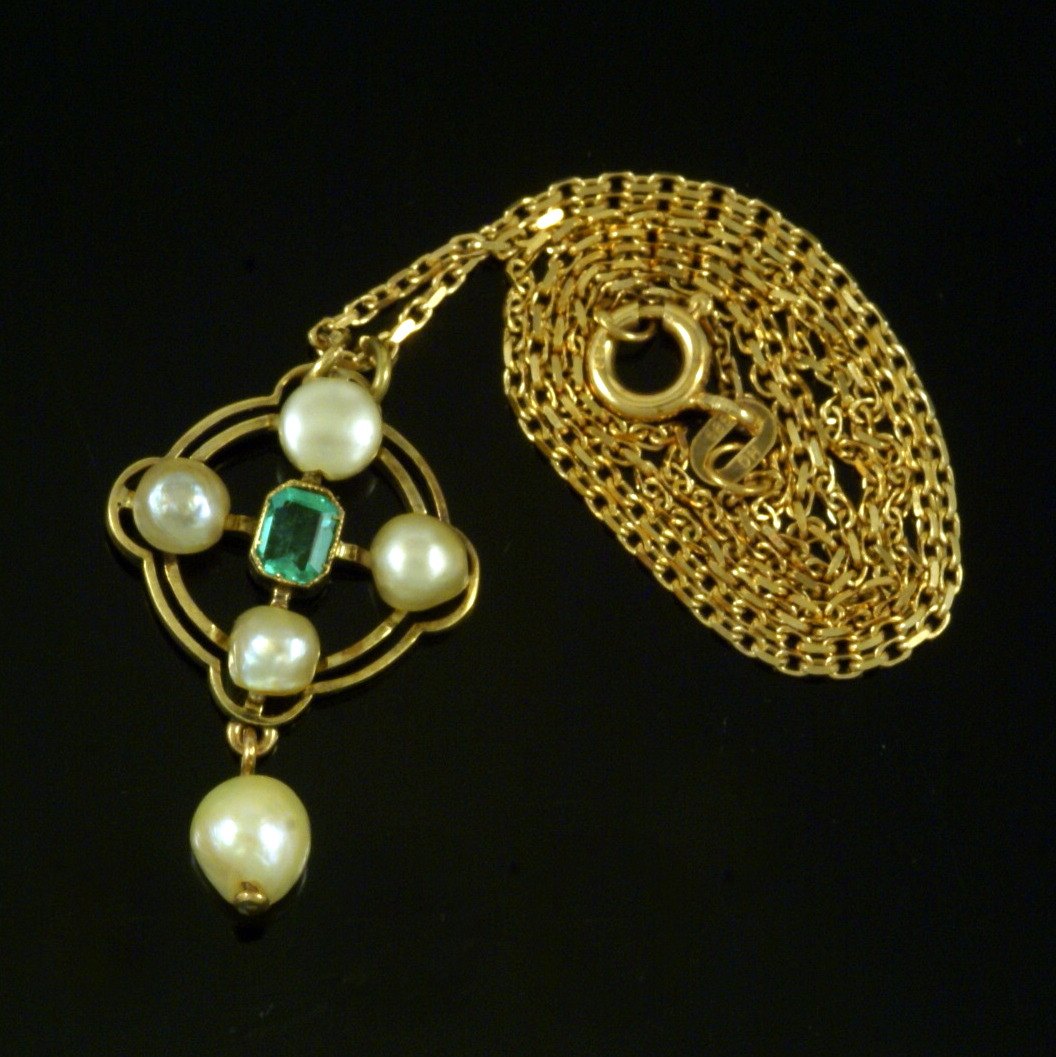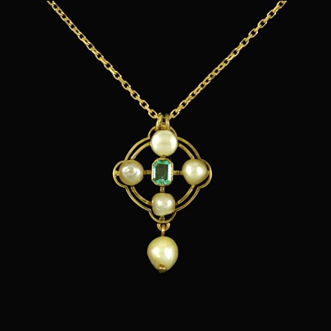 Vedhæng i 14k guld med orientalske perler og smaragd.