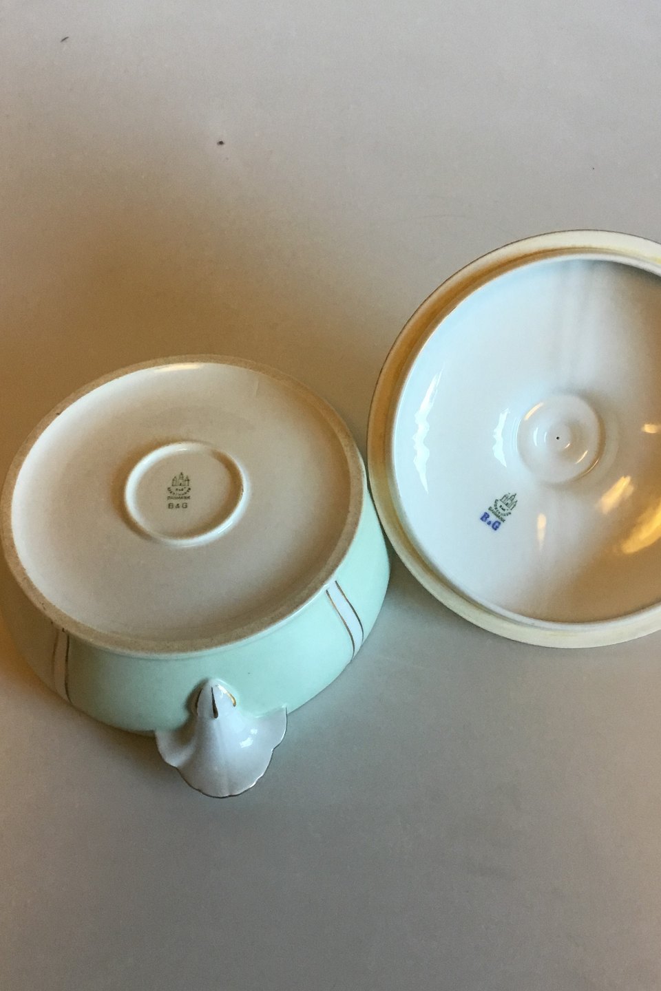 Bing & Grøndahl Stel med grøn dekoration med guld på form 507(Herregaard) Rund Terrin med låg