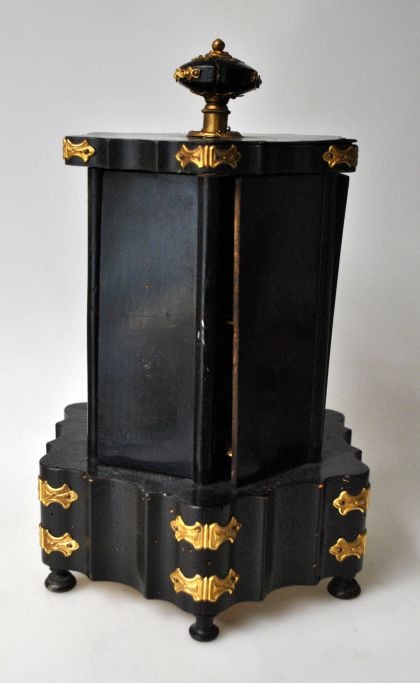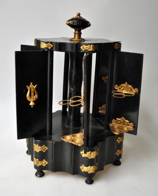 Cigar holder, 19. årh. Med 6 drejbare låger. Sortlakeret træ. Med talrige messing dekorationer. På 6 fødder. H.: 28 cm.