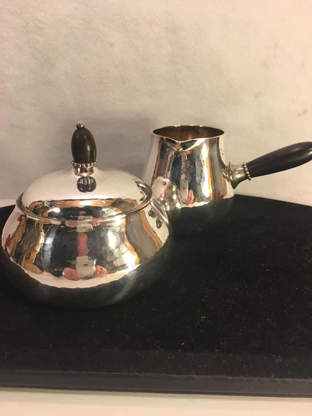 Sukker og flødekande af let hammerslået sterlingsølv 925s , glat buttet korpus, stjerthanke og lågknopper af sort ibenholt. Dessin 80 A.