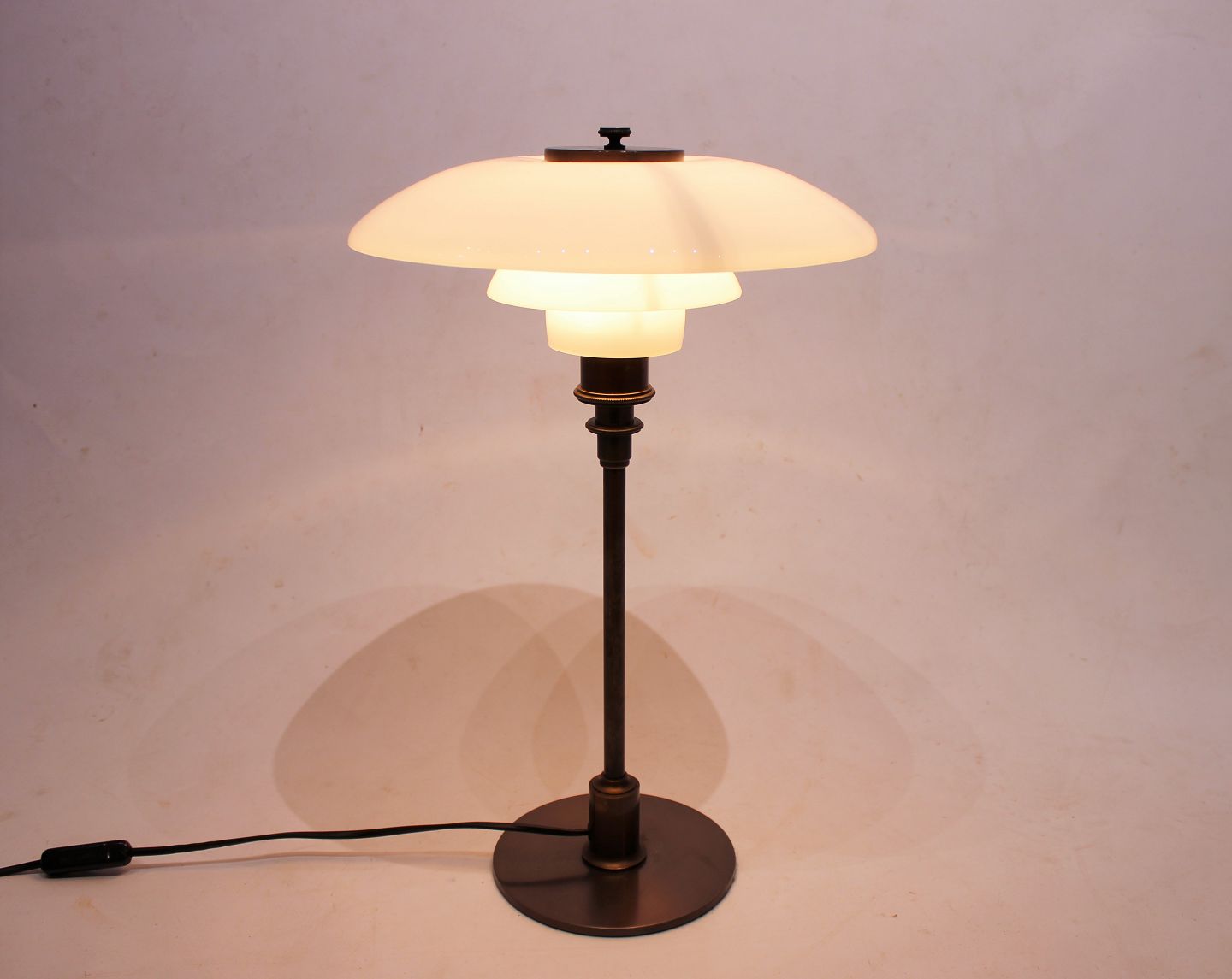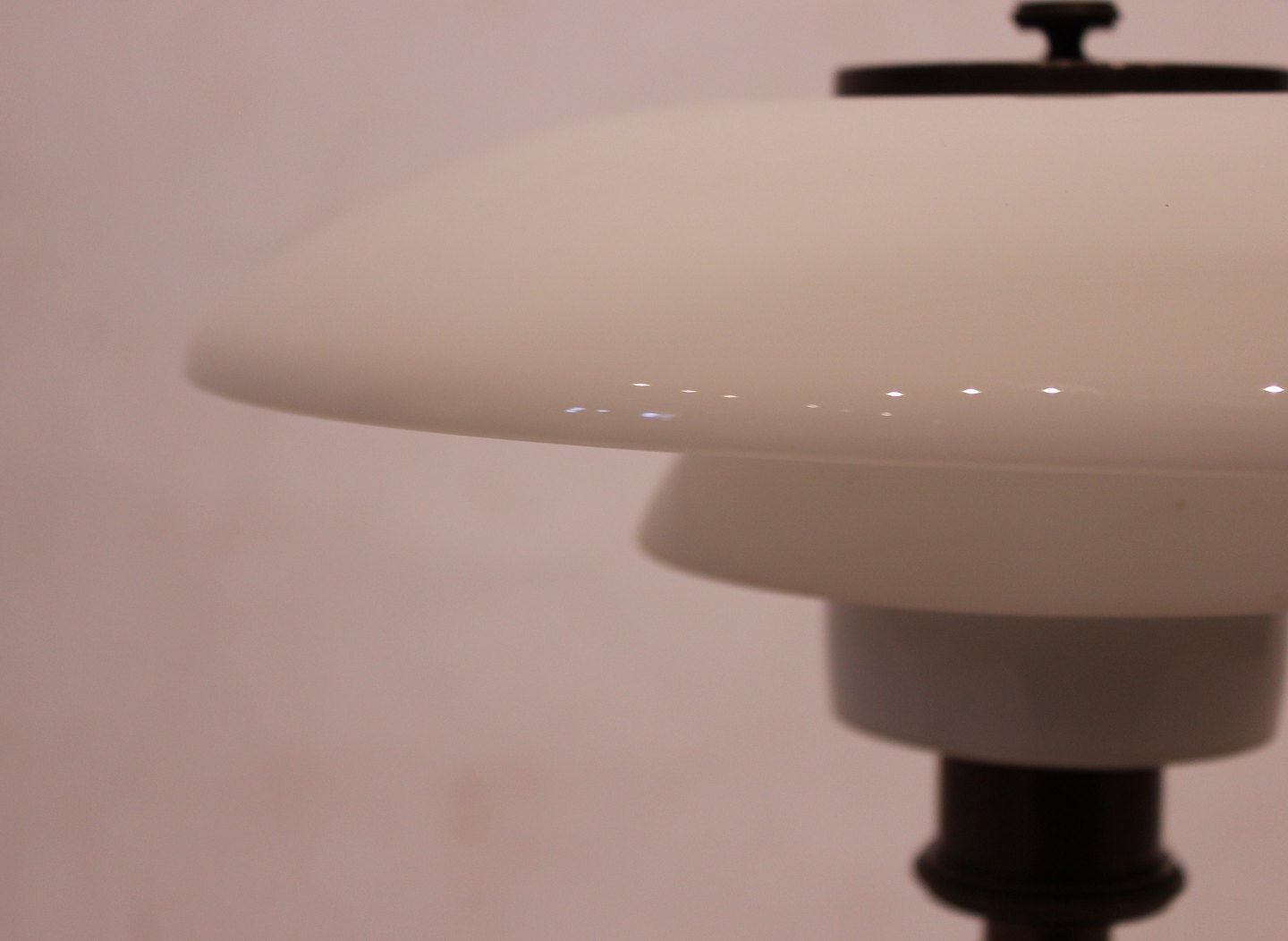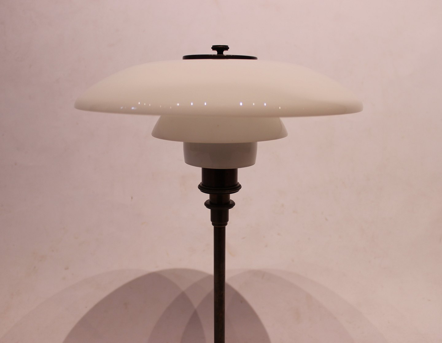 PH 3/2 tablelamp, model Treph, of white opaline glass and frame of burnished brass.