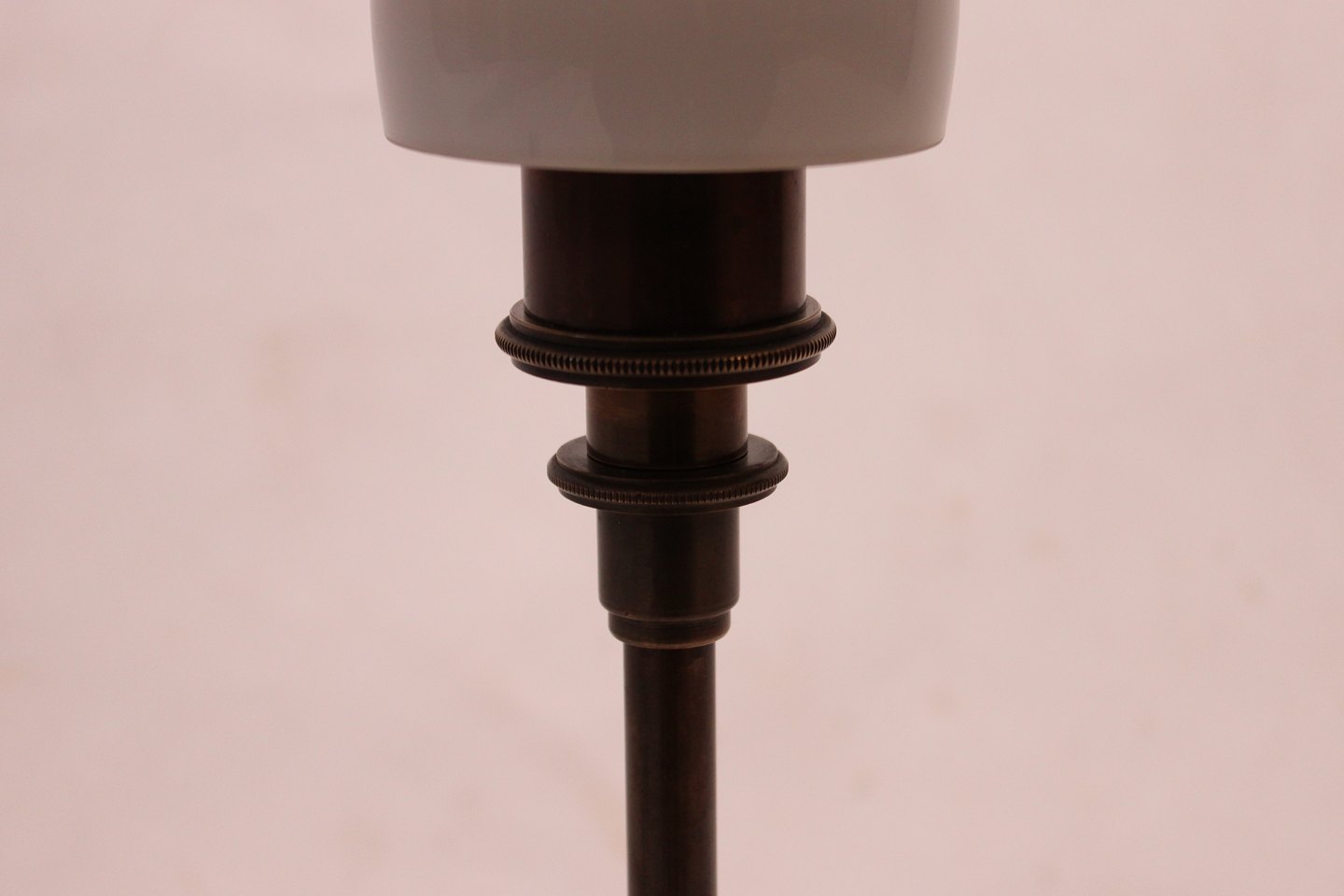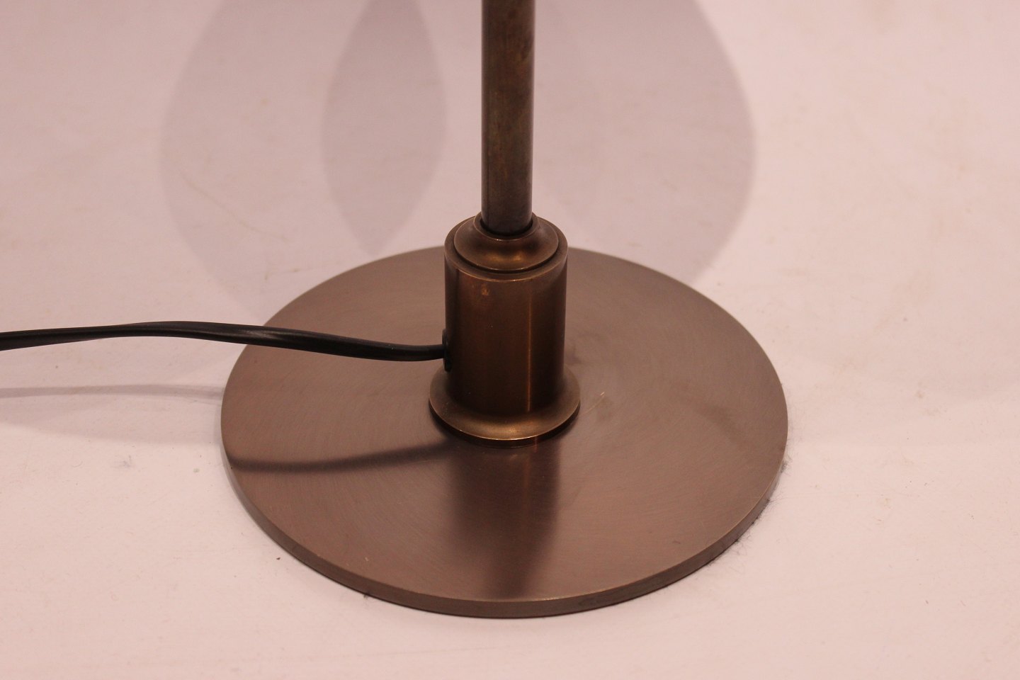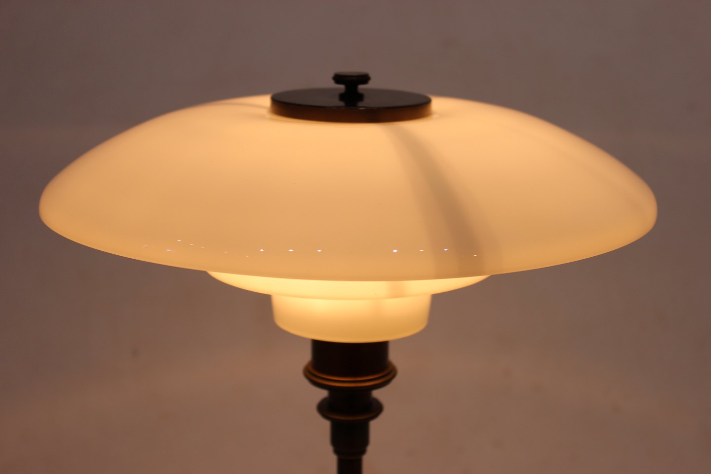 PH 3/2 tablelamp, model Treph, of white opaline glass and frame of burnished brass.