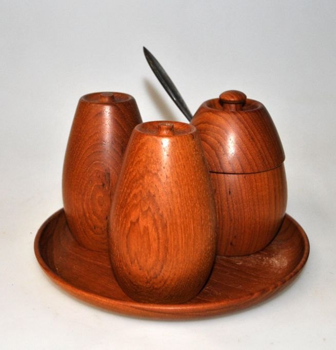 Salt, pepper - mustard set in teak, Wiggers, 1960s, Denmark. With tray. Tray: dia: 17 cm. Height: 9.5 cm.