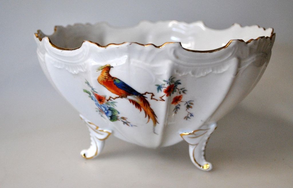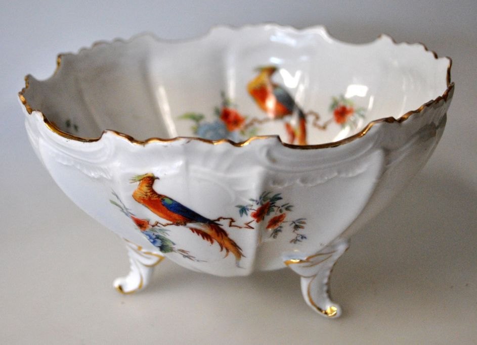 Porcelain bowl with decorations of peacocks in transfer technique, 20th century Germany.