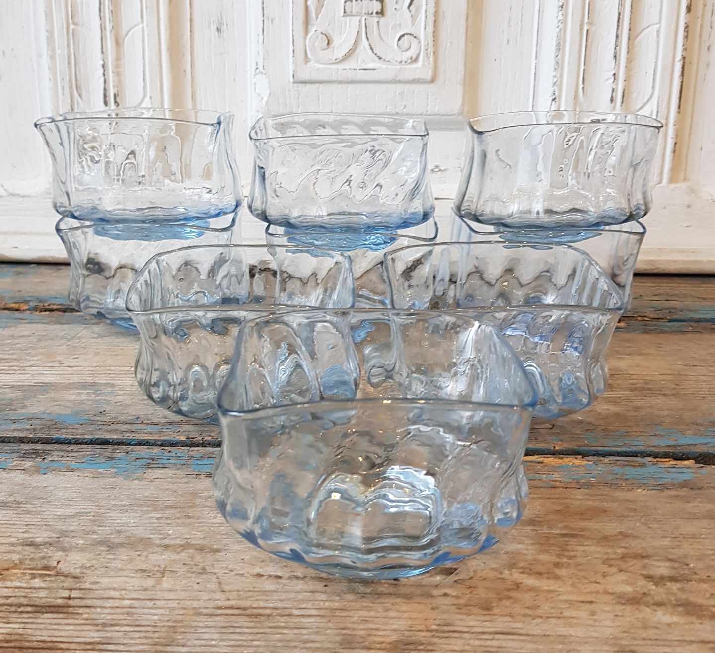 Sæt på 9 skylleskåle i lyseblåt glas.