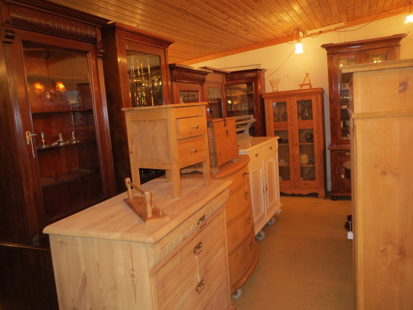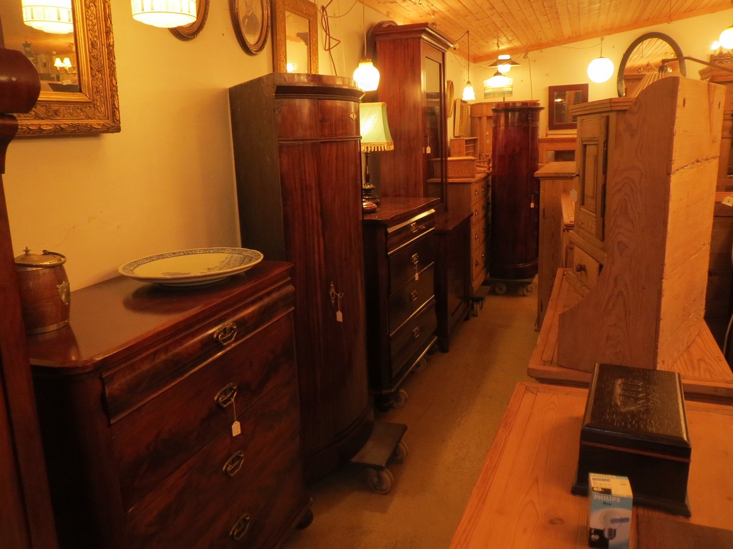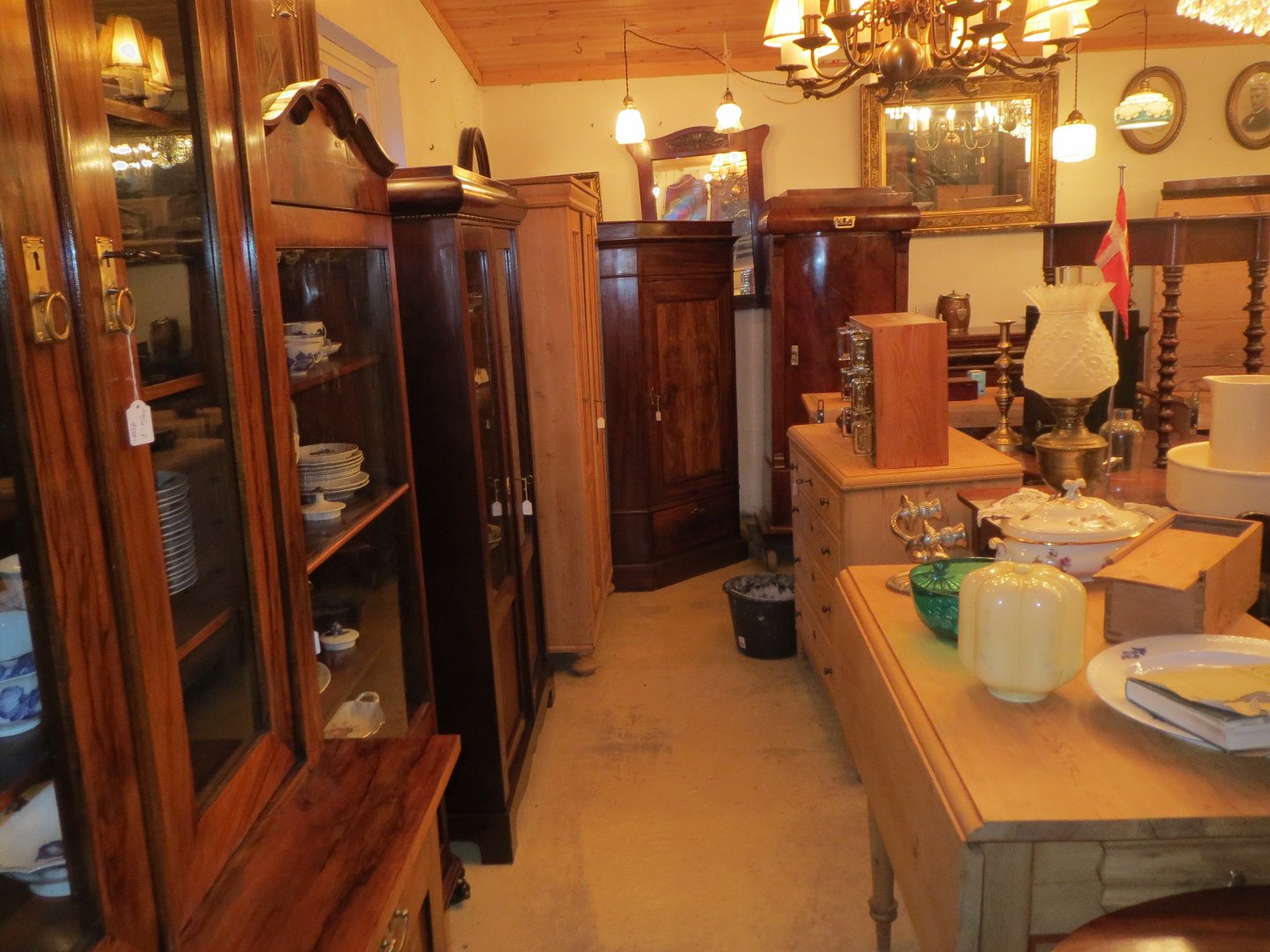 Stor salgsudstilling med restaurerede møbler håndpolerede mahognimøbler, afsyrede fyrretræsmøbler, malede træmøbler, kun originale gamle og antikke møbler.