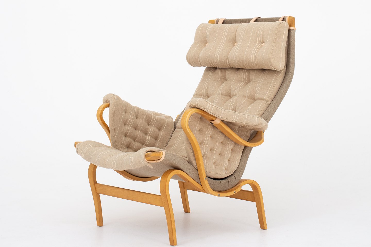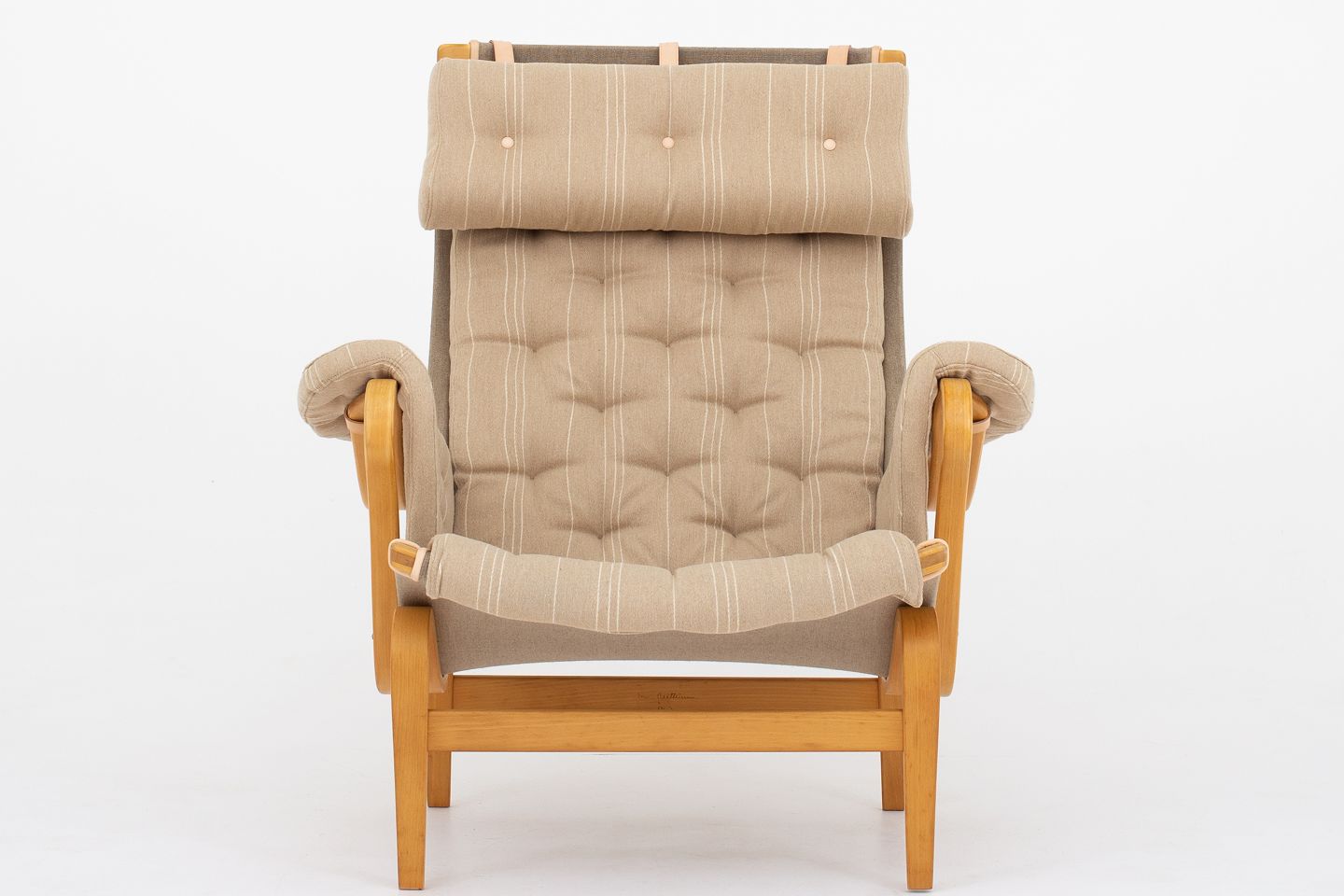 Pernilla 69 - Nybetrukket lænestol i bøg med Aalborg Møbelstof (Dessin A, farv. 11). KLASSIK tilbyder polstring af lænestolen med stof eller læder efter eget ønske. Kontakt os venligst for mere information.