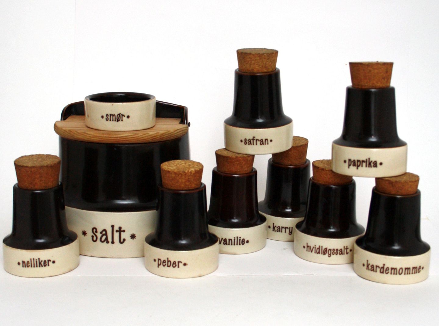 Søholm, Rikke, krydderikrukker. Højde uden korkprop 8 cm. Pris: 75 kr. stk.