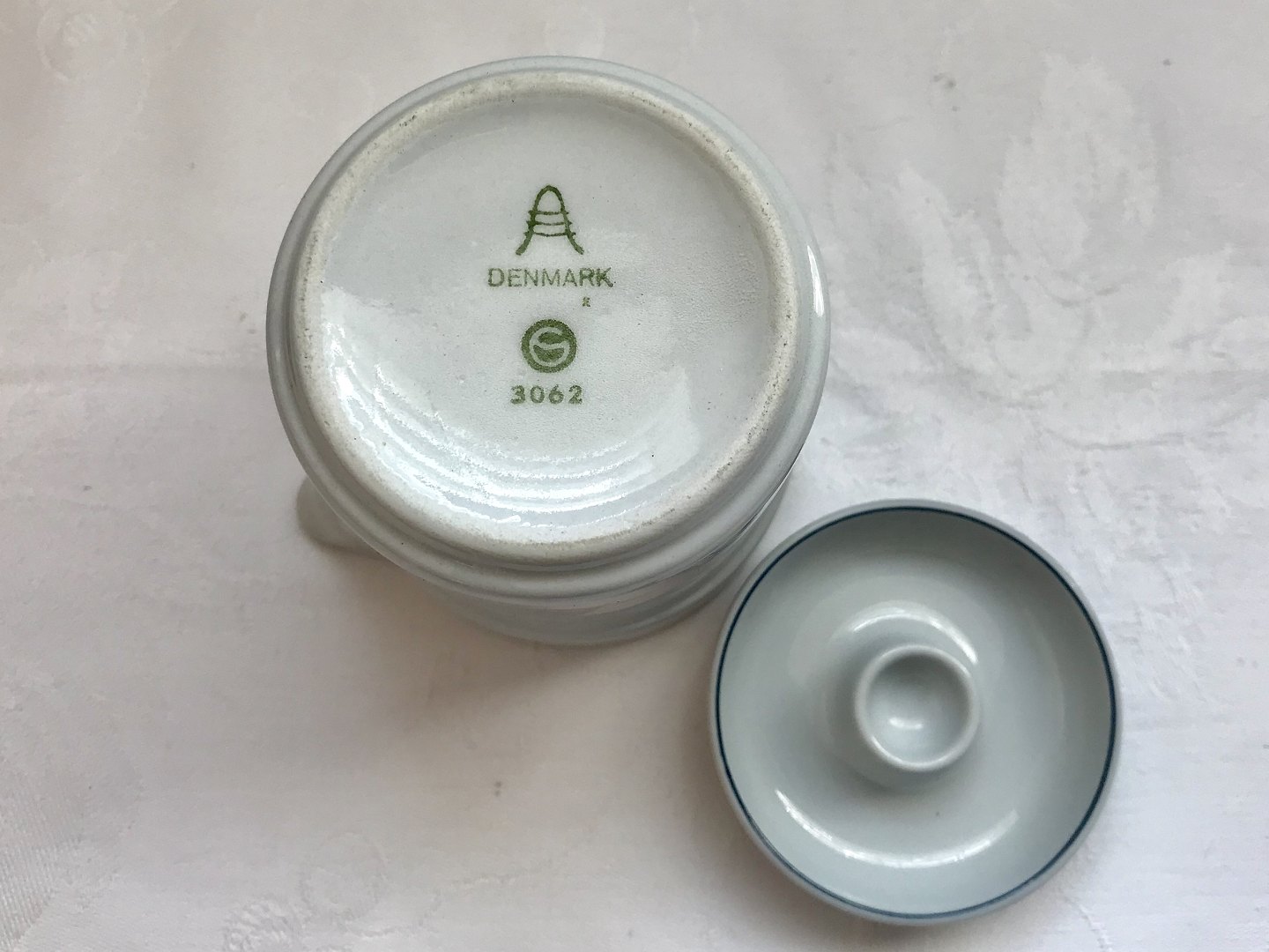 | Royal Copenhagen, Aluminia, Blå kant, Flødekande #3062, 8cm høj, 7,3cm i diameter, 1.Sortering, Design Grethe Meyer *Pæn stand*